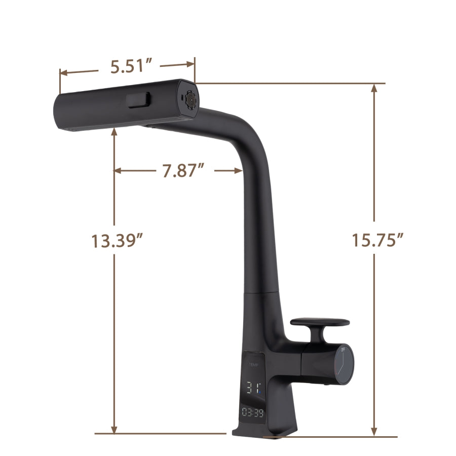 Temperature&Time DisplayUnique Waterfall Mode DesignThree spray settingSingle handle controlHot and Cold WaterPull Down Sprayer Description This kitchen sink faucet with sprayer is equipped with a temperature display function, allowing you to easily monitor the water temperature and avoid scalding or freezing your hands. As the temperature rises, the display will...