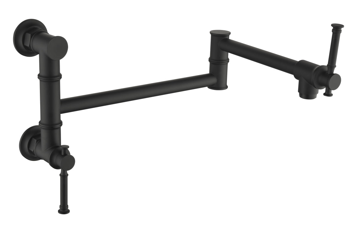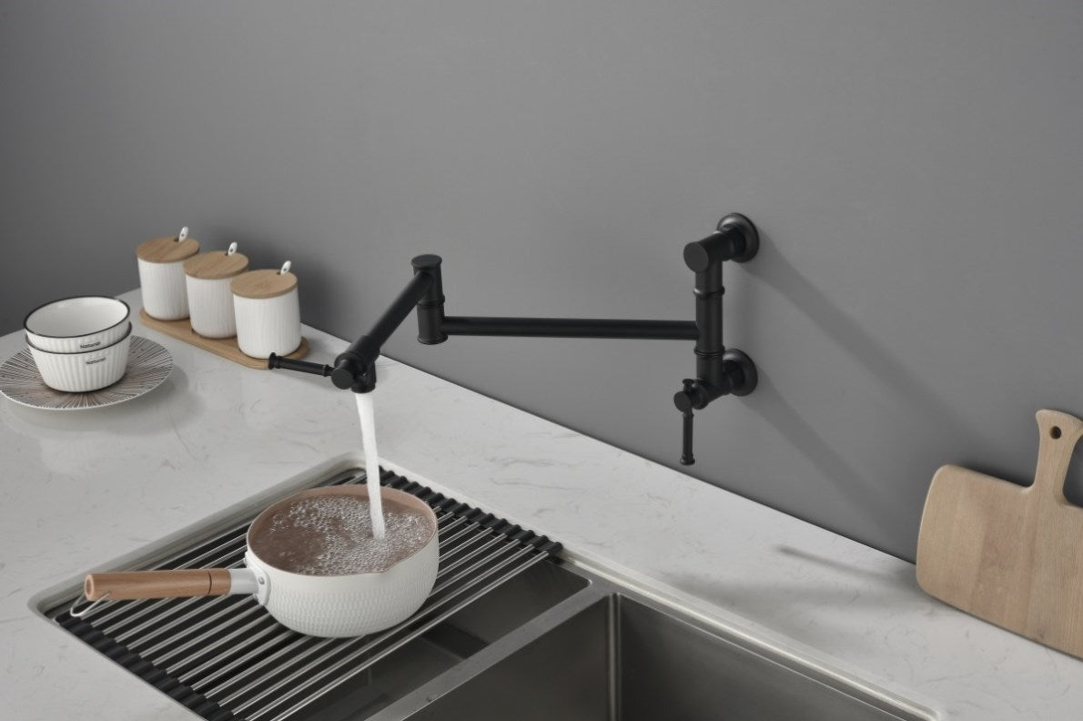 The pot filler faucet features a free-swivel arm design, making it easier to fill any pot on the stovetop and for easier cleaning.