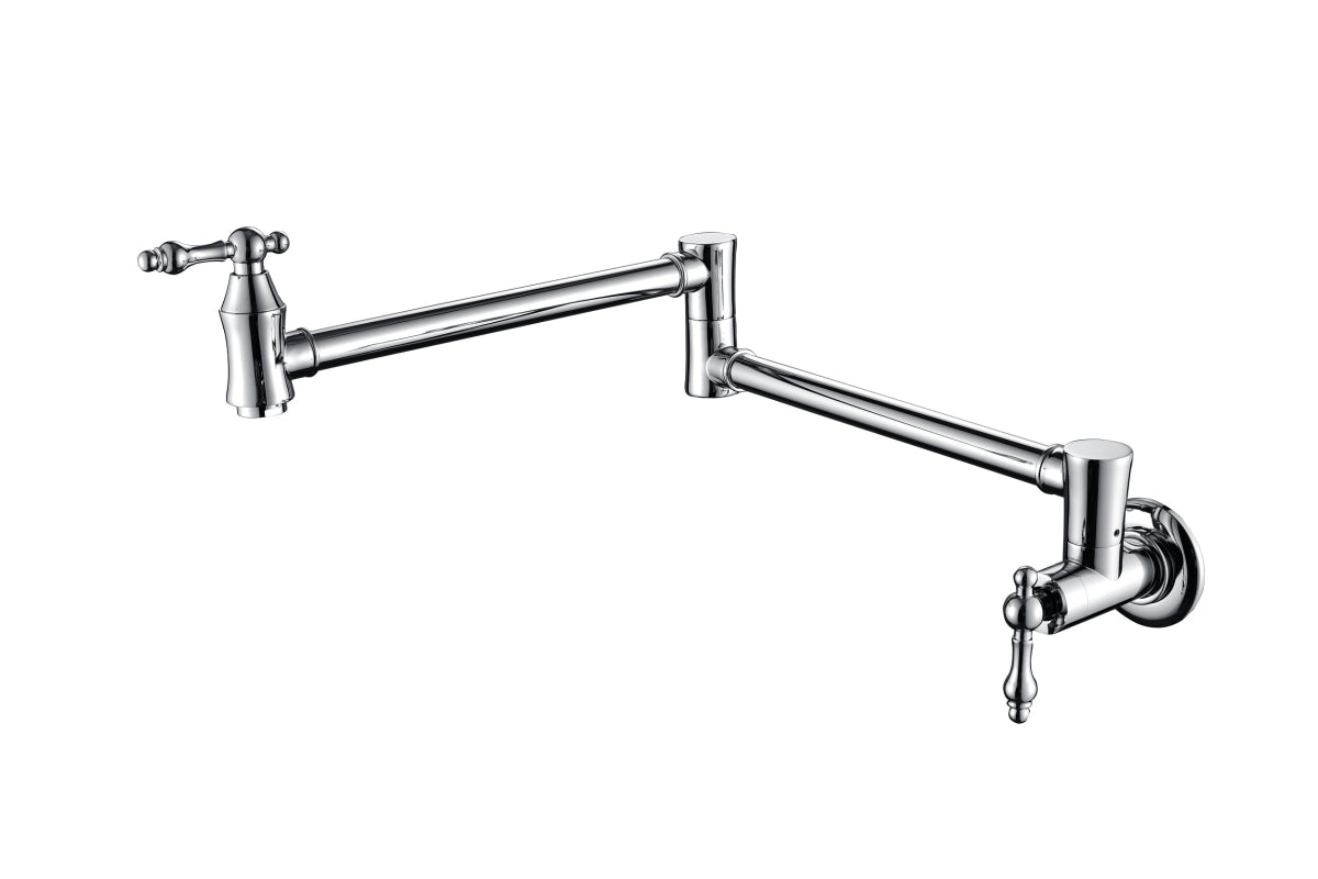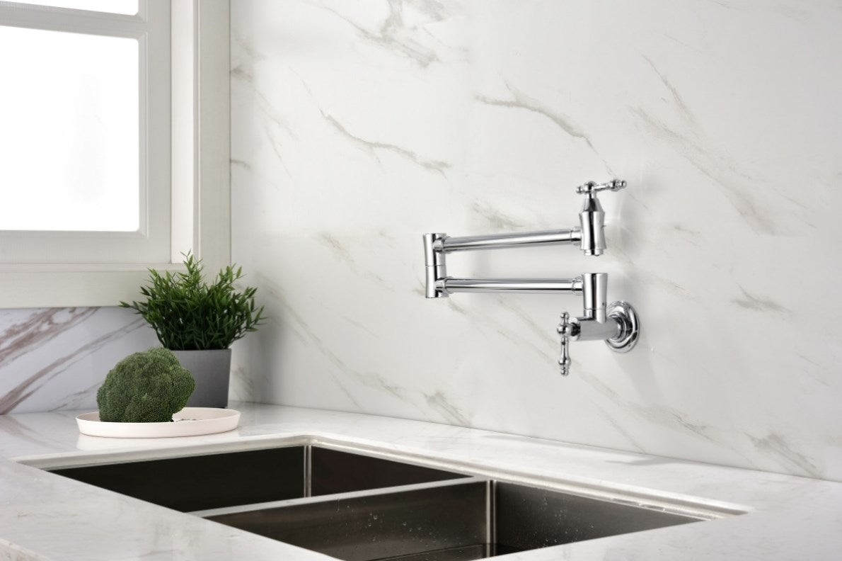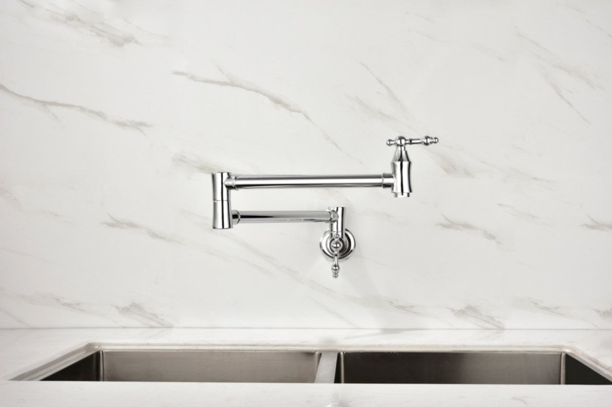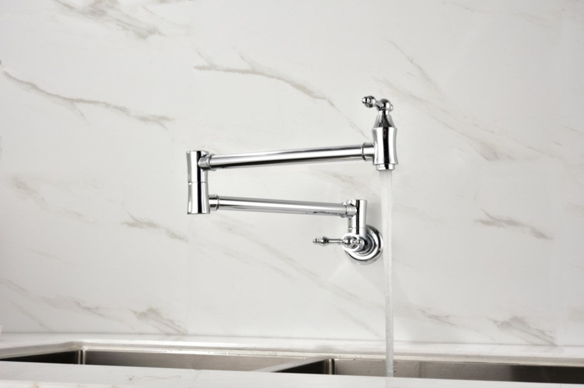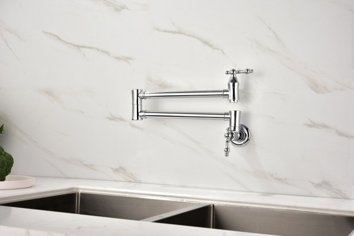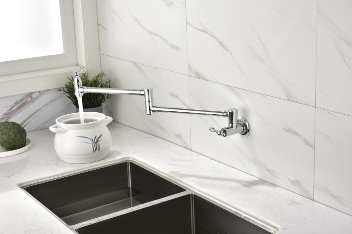 The pot filler faucet features a free-swivel arm design, making it easier to fill any pot on the stovetop and for easier cleaning.