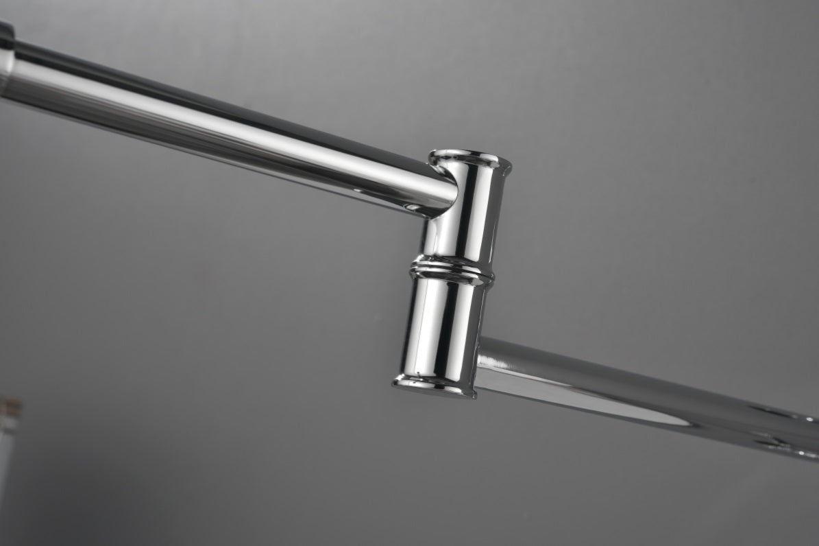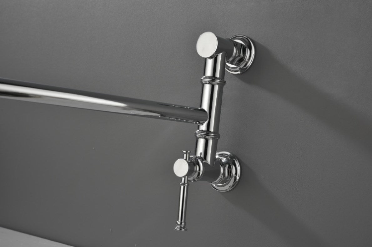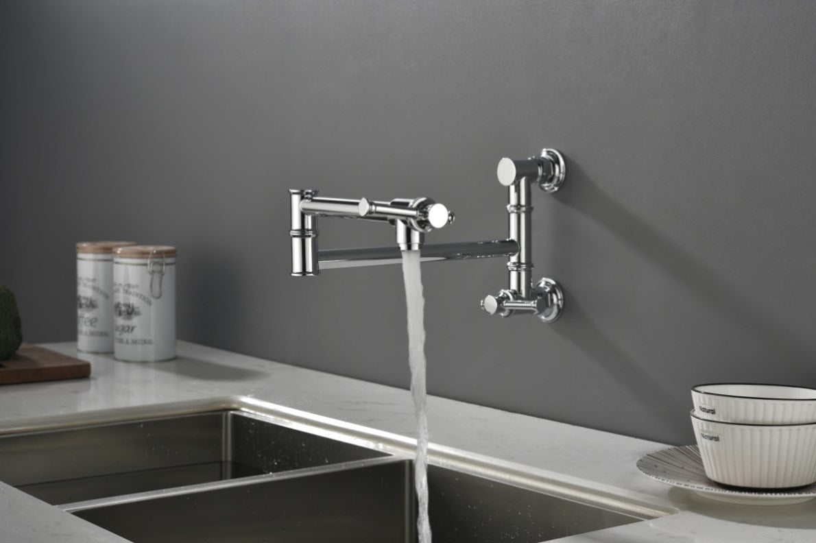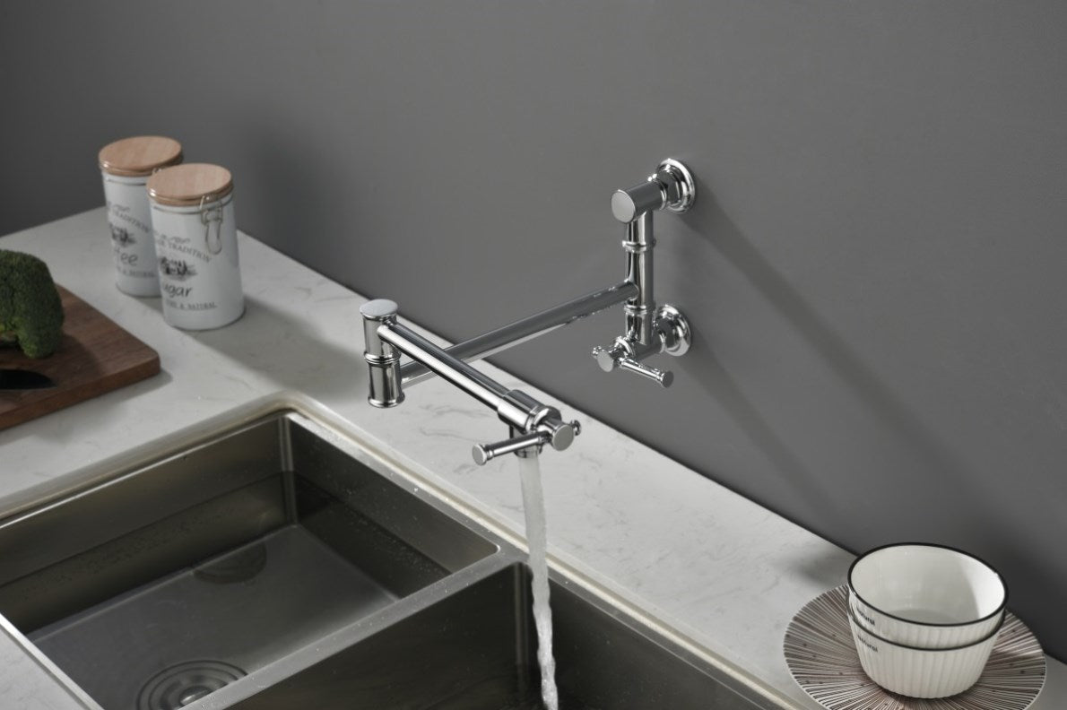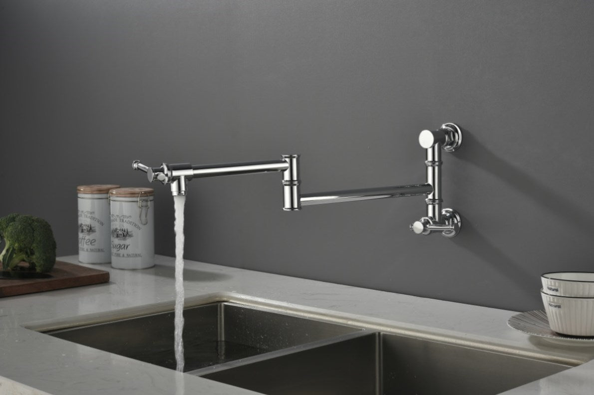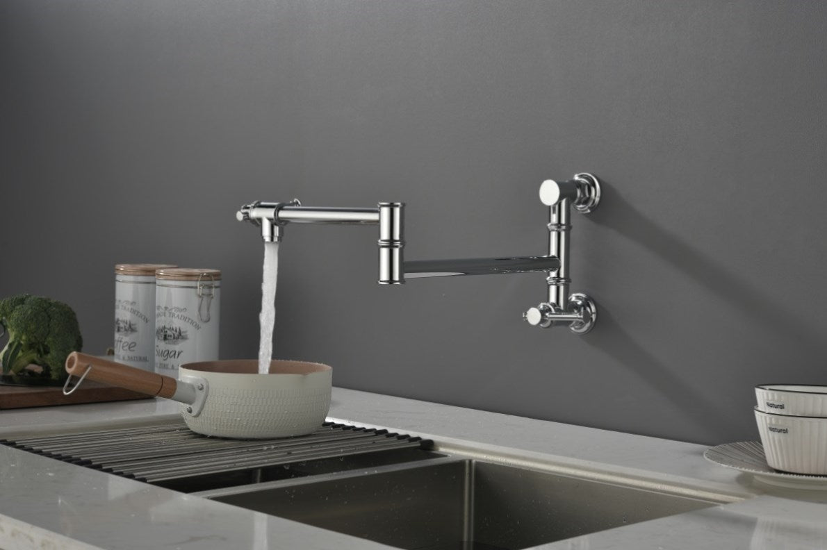 The pot filler faucet features a free-swivel arm design, making it easier to fill any pot on the stovetop and for easier cleaning.