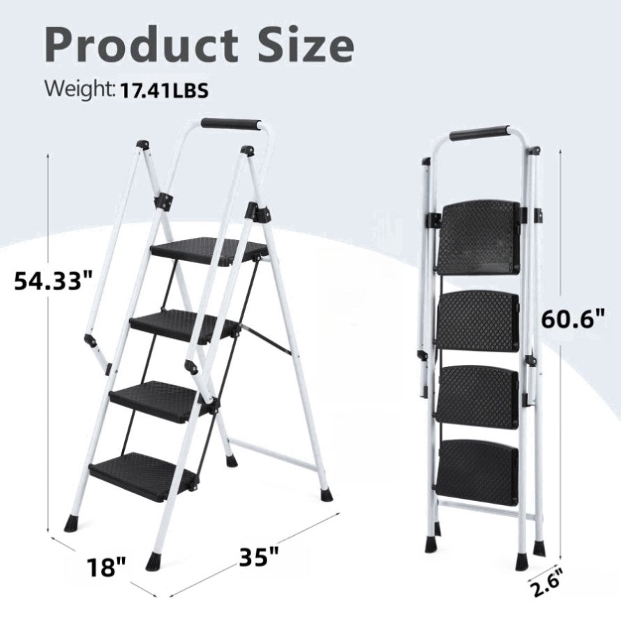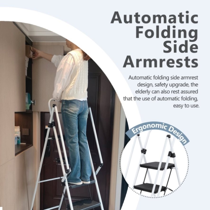 Ergonomic ladder: the high-strength steel frame structure is firm and reliable, and the four anti slip pads have strong traction, allowing you to easily climb the steel ladder stool, while still providing you with good support and security