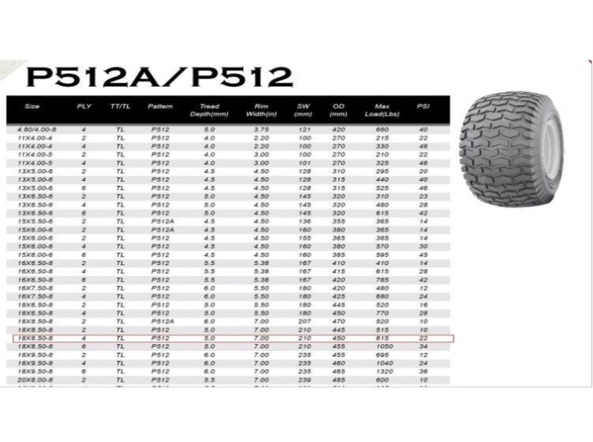 Specifications:1. PLY: 42. Pattern: P5123. Tread Depth (mm): 54. Rim Width: 7.00 inch5. SW: 8.27" / 210mm6. OD: 17.68" / 449mm7. Tire Load Range: Max. 815 lbs8. PSI: 229. Tire Size: 18x8.50-810. Quantity: 2 Pcs11. Placement on Vehicle: Front,RearPackage Includes:2 x Tires