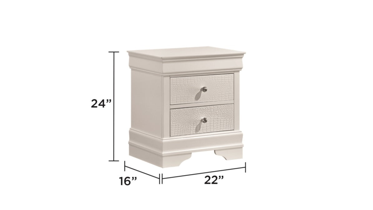 This chic nightstand is a blend of classic style and modern functionality, making it a superb addition to any bedroom. Its sturdy construction ensures longevity, while the elegant finish complements a wide array of bedroom decor styles. The nightstand features two spacious drawers, with the top drawer lined in luxurious red velvet, perfect for storing delicate items or personal belongings. The textured exterior, coupled with shimmering crystal-like knobs, adds a touch of sophistication and luxury, enhancing the overall aesthetic of your bedroom. Available in both gray gunmetal and white, this piece easily integrates into any design scheme.