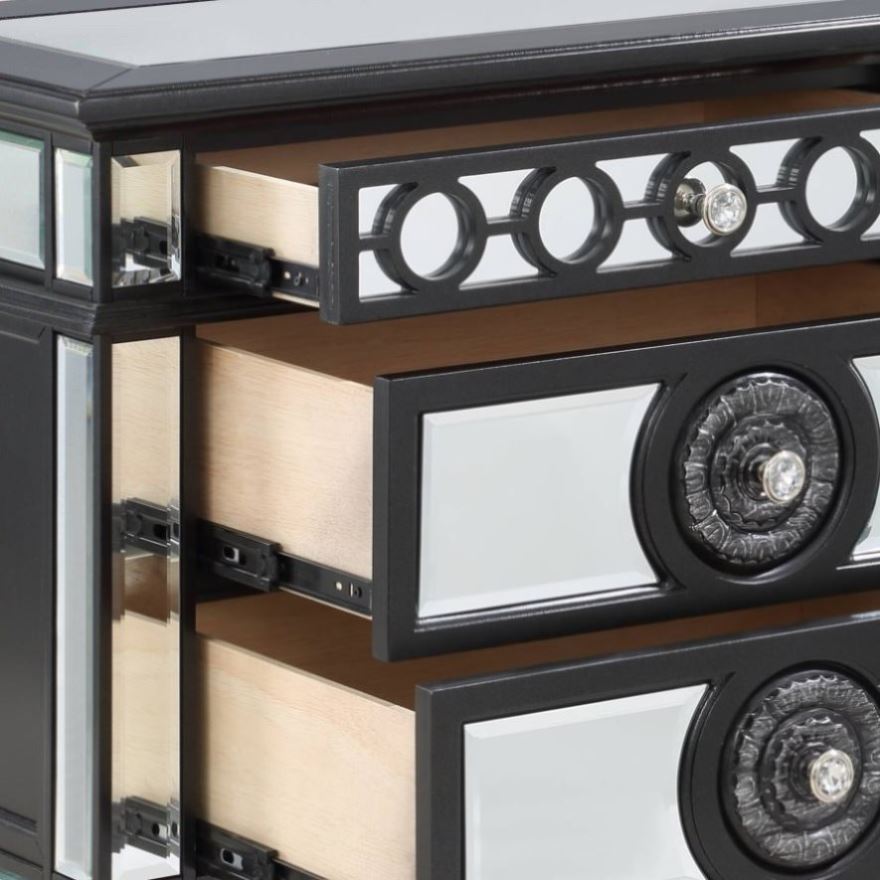2 Drw, Mirrored Top, Raised Geometric Trim, Sunburst Motifs, Drawer: Glide Side Metal (3/4 Ext.)
