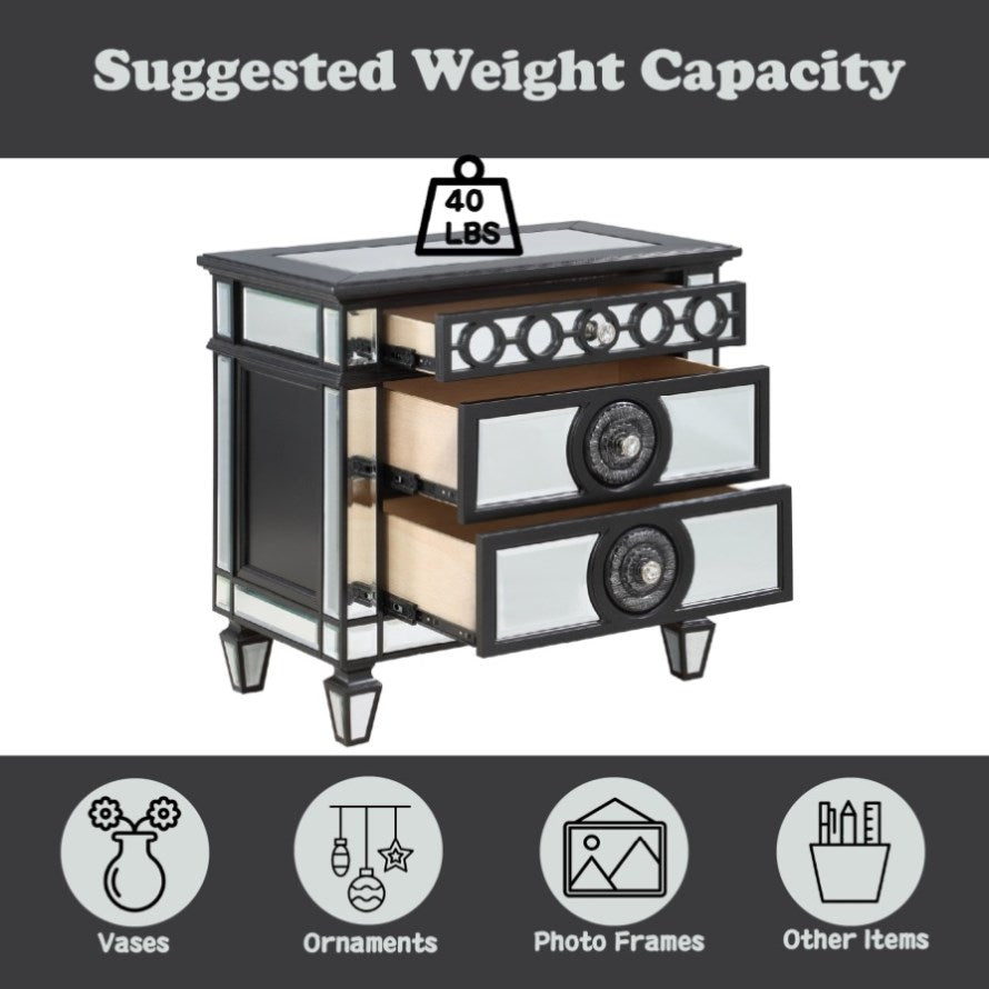 2 Drw, Mirrored Top, Raised Geometric Trim, Sunburst Motifs, Drawer: Glide Side Metal (3/4 Ext.)Dovetail English Front & Back, Felt-Lined Top Drawer (unfinished), Safety Stop, Hardware: Crystal like KnobsCONSTRUCTION: Wooden Case Frame: Mirror Inlay, Poplar Wood, MDF, Ply, Mirrored Tapered LegMaterial: Mirror, Wood (Pine), MDF, PlyWeight Limit: 40lbsProduct Dimensions (Approximately)41.85...