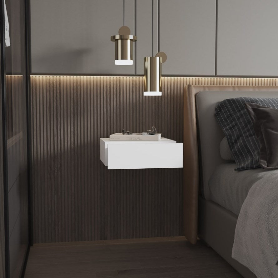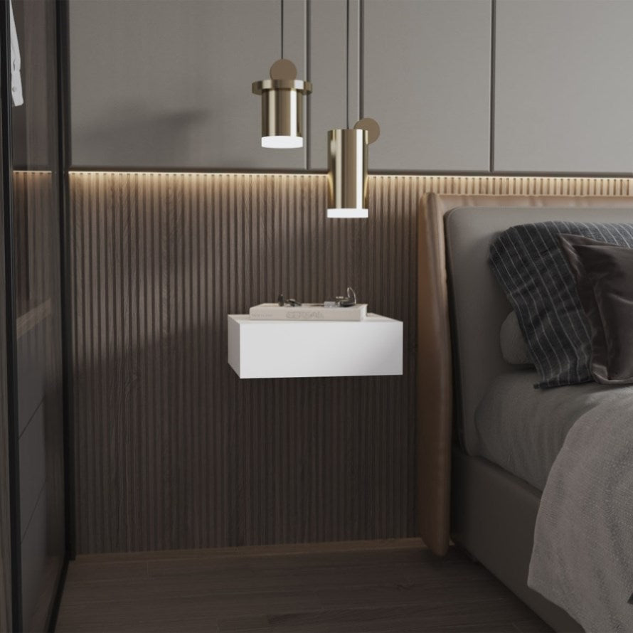 Experience the sleek, space-saving solution of the floating nightstand's wall-mounted design, enhancing room aesthetics while providing functionality