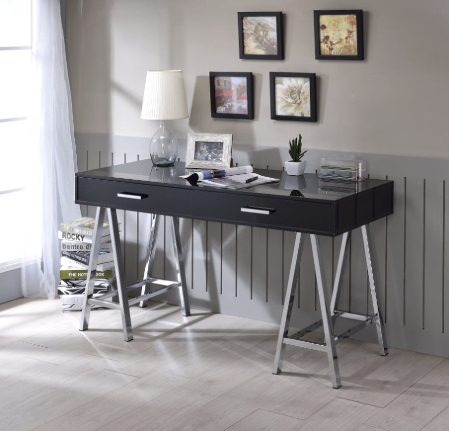Rectangular Writing Desk, 2 Drawers, Metal Sawhorse Base: Chrome Finish, High Gloss Finish