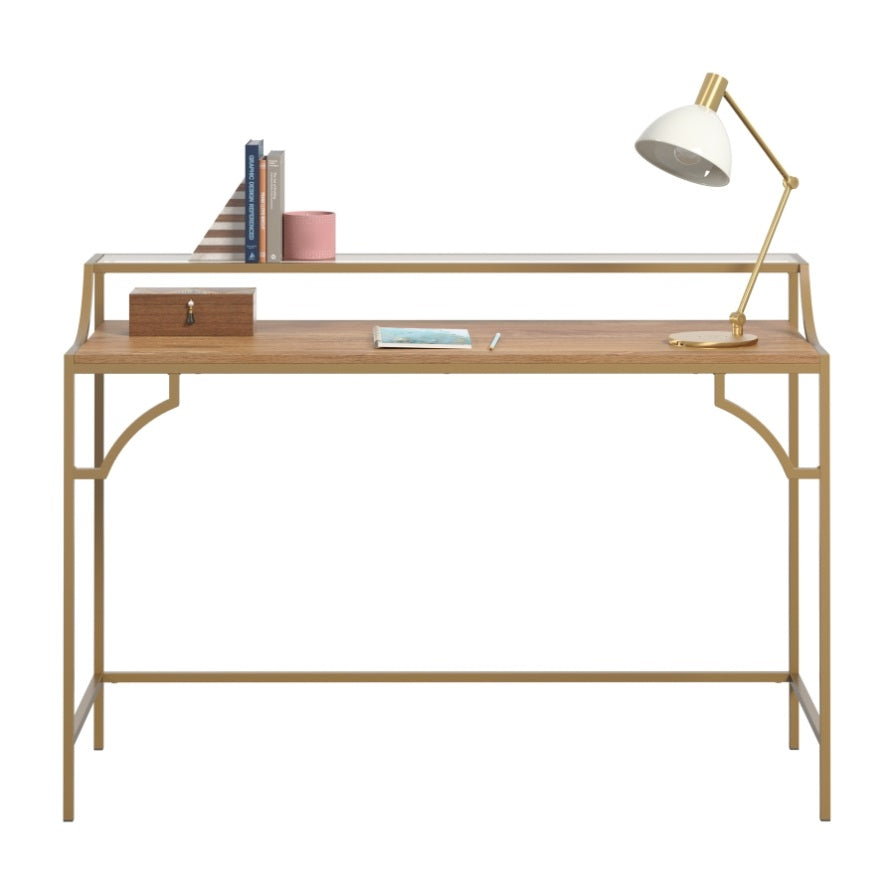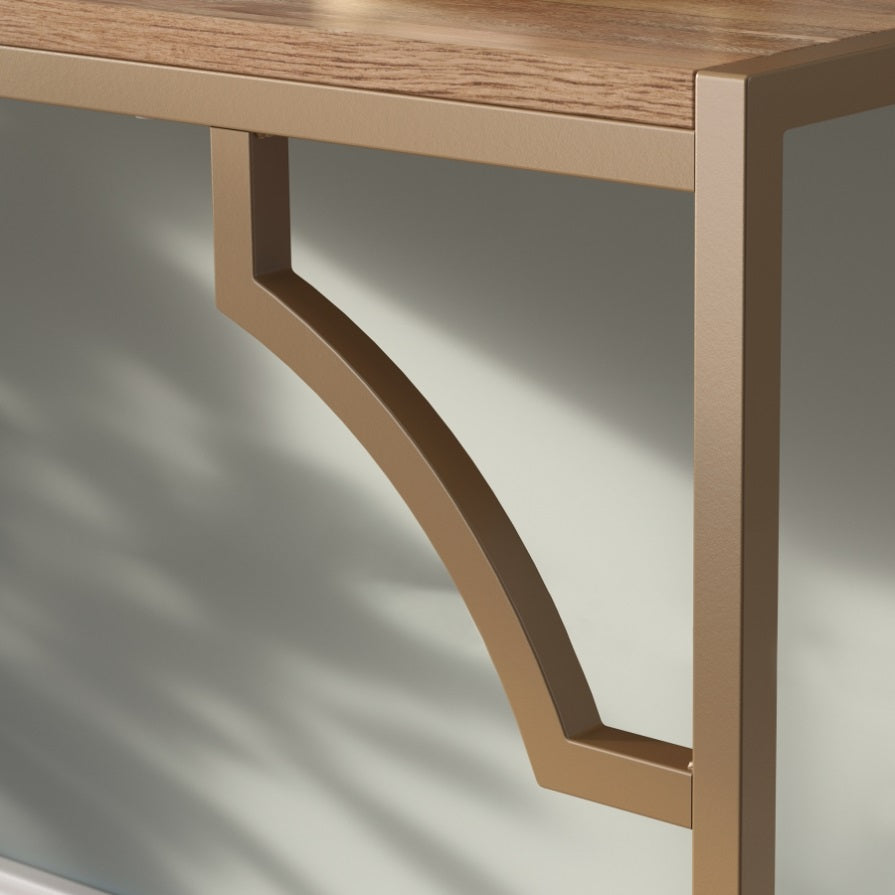 Ornate design with sleek silhouette for home or office Generous work surface accommodates laptop and writing materials Suitable for multiple rooms including guest room and hallway Warm mango wood finish complements diverse decor styles Sturdy metal frame with satin gold tone for lasting durability Compact dimensions fit various spaces Quick...
