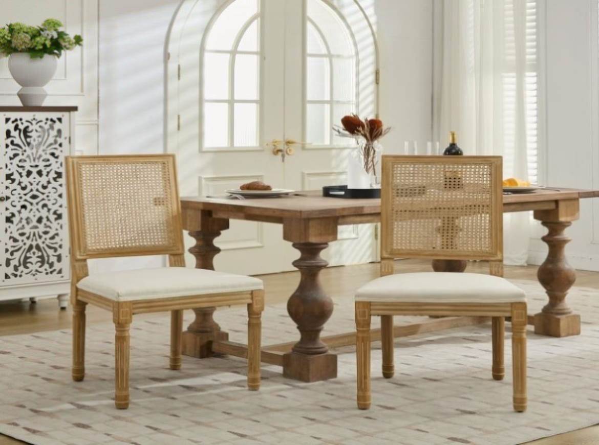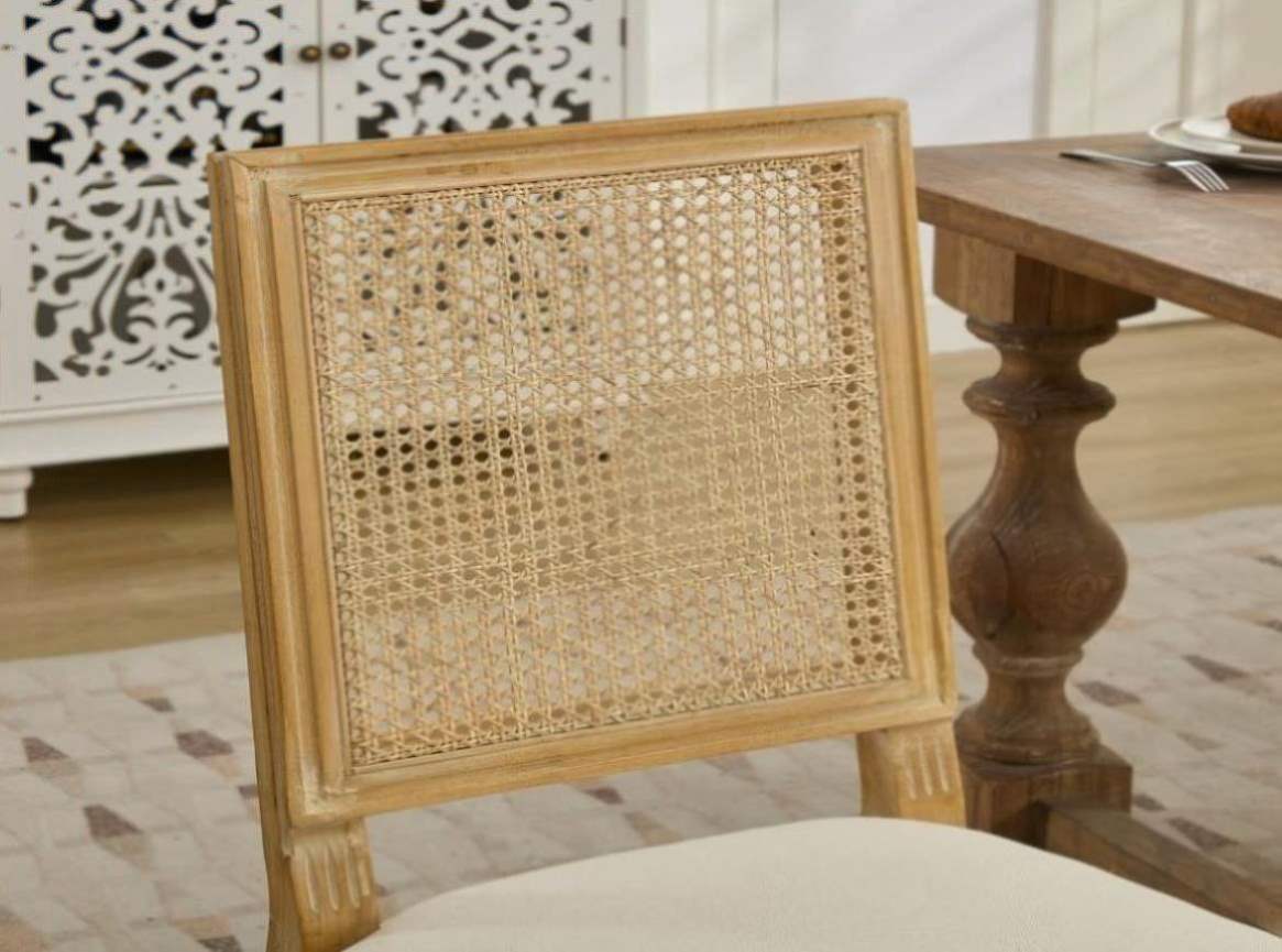 Comfortable and durable linen fabric upholstery with a stylish rattan backrest.Elegant French style design with a solid wood frame and antique painted finish.Soft foam and Steel Spring inner filler provides excellent cushioning for extended sitting.The chair's frame and legs are made of solid wood with enough security to hold up...