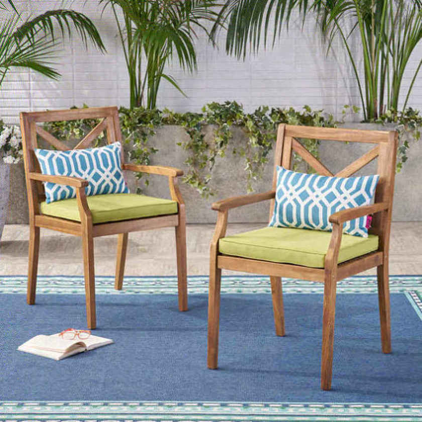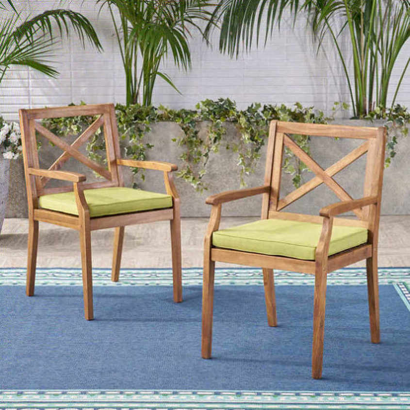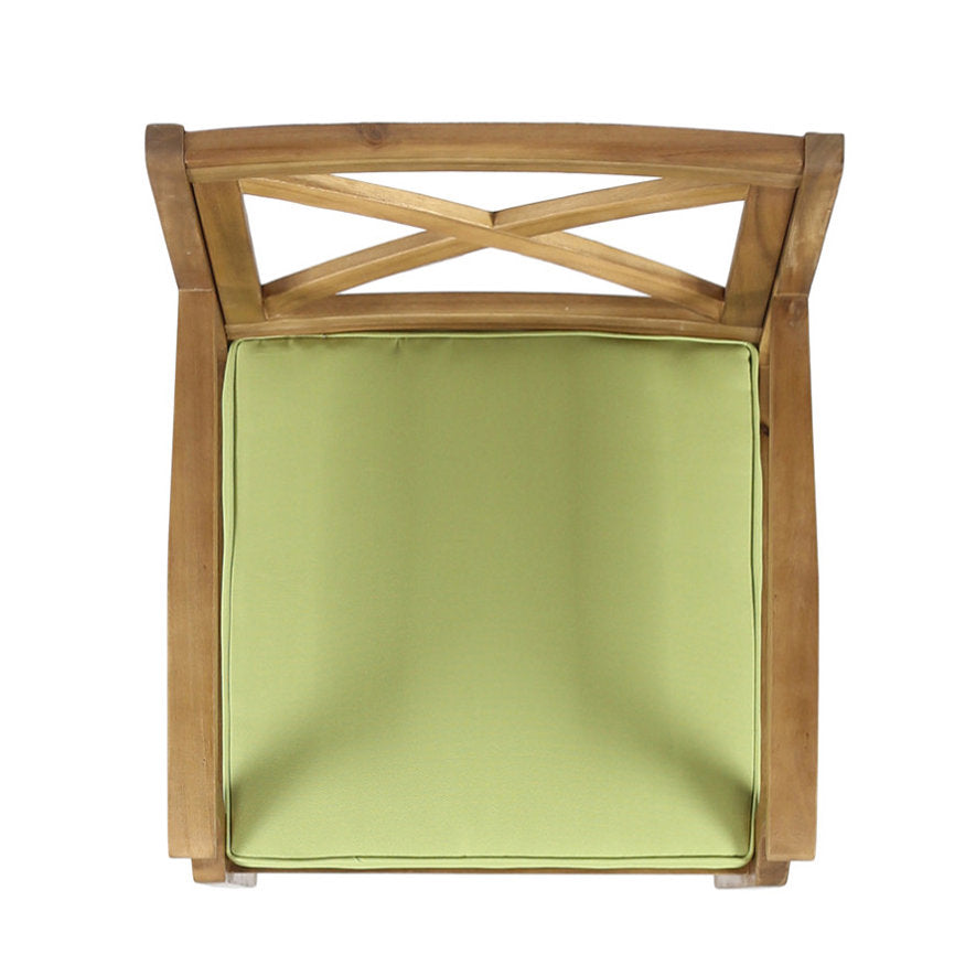 Durable and Comfortable: Crafted from acacia wood with water-resistant fabric cushions, these chairs are designed to withstand the elements while providing comfort for extended outdoor use. The refreshing cream green cushions add a pop of color and a hint of nature to your outdoor space.