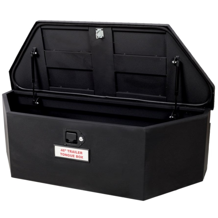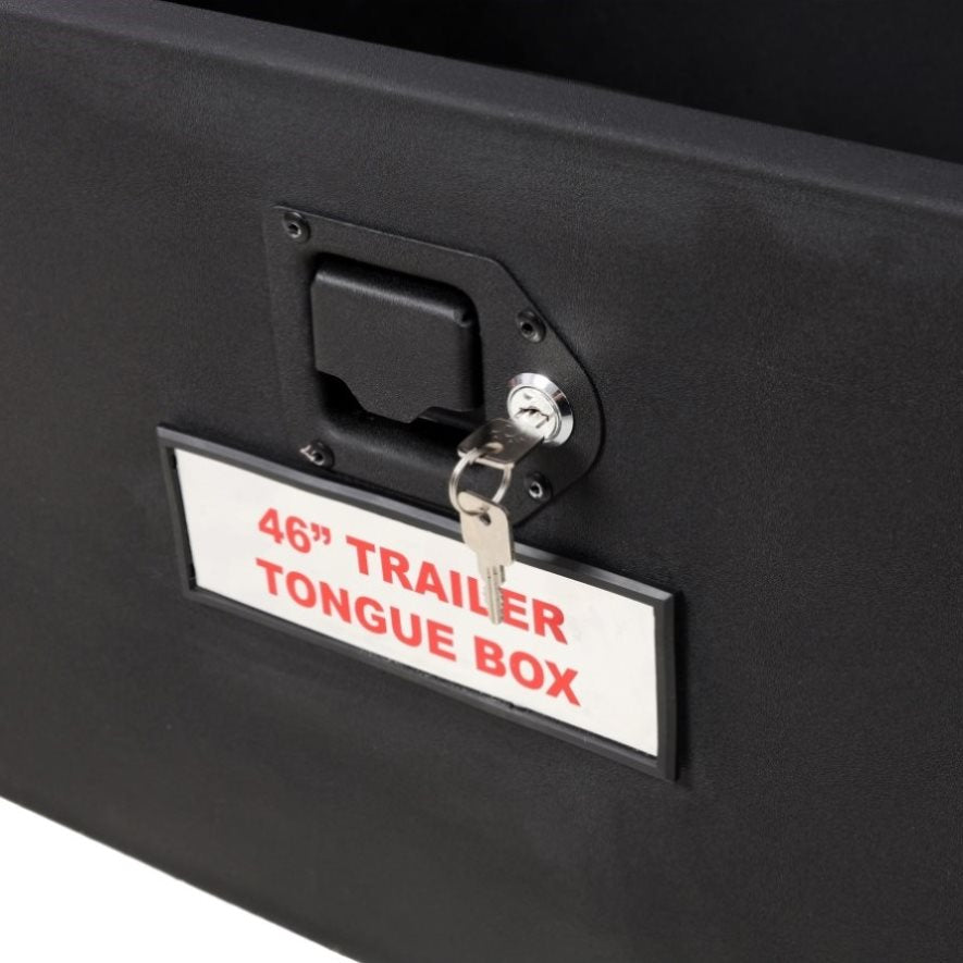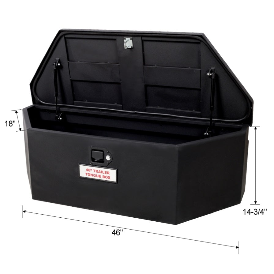 46"X18"X14.5" Tongue Truck Box Black Heavy Duty Steel Trailer Tongue Box Pick Up Truck Tool Box Storage Organizer w/Lock & KeysWeather-resistant steel body made with a foam weather seal to keep your tools dry. Surface Finish: Powdercoated Black SteelCompatible with most trailer A-frame tongues. Large 6.71 cu. ft. storage area...