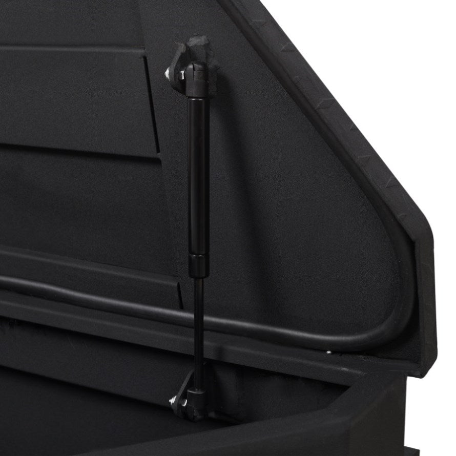 Convenient 1-handed close thanks to the dual dampened gas shocks and paddle style handle. Security features include the lockable design and the tamper-resistant double-wall lid.