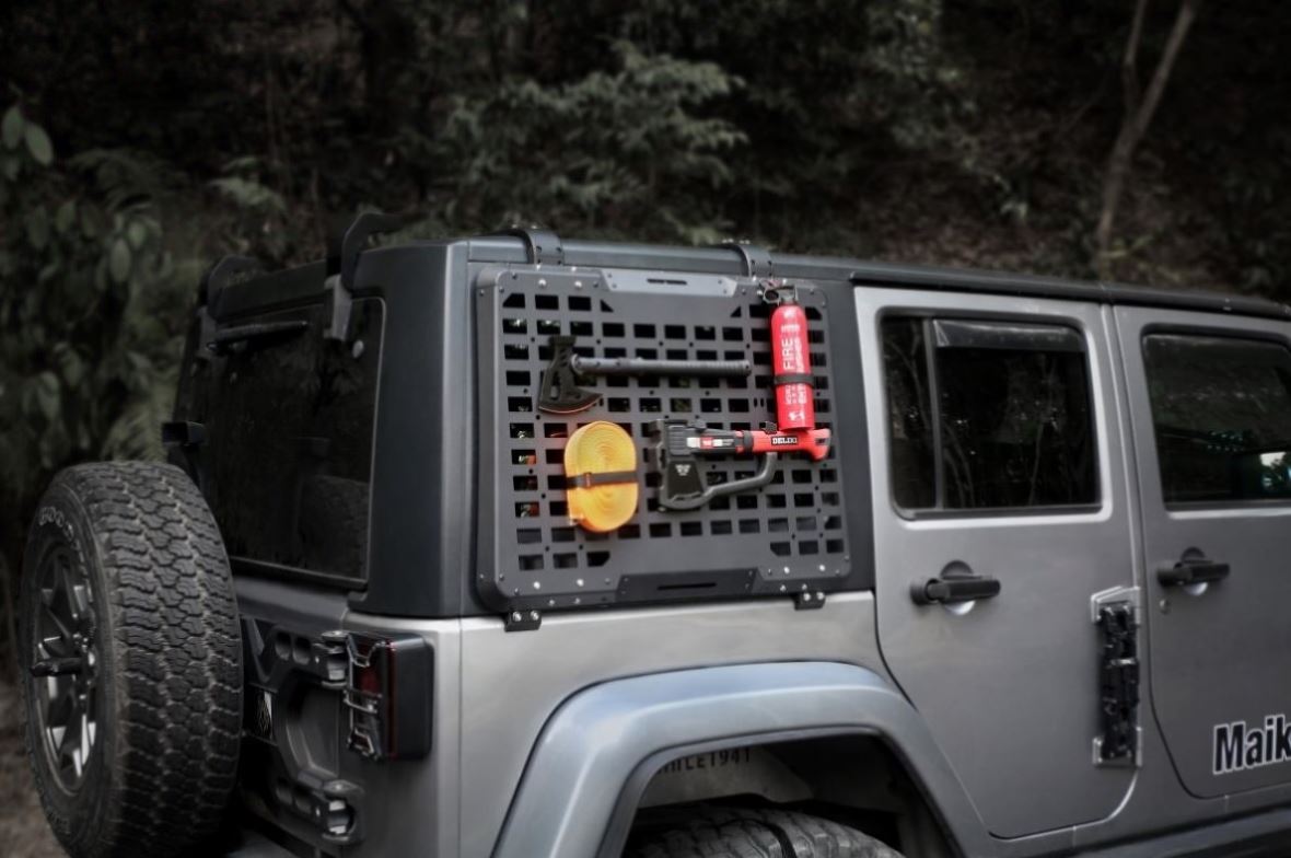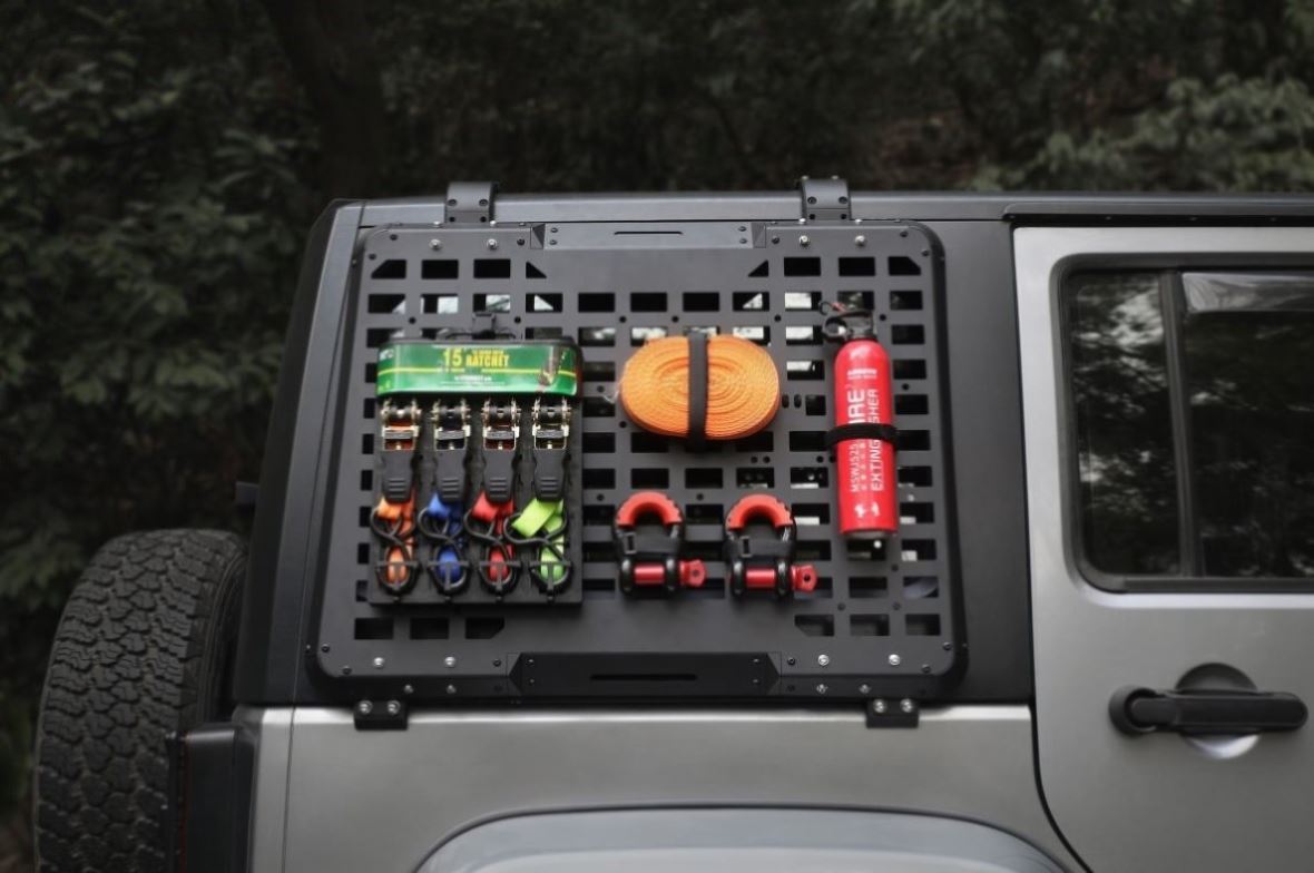 Maximizing Your Cargo SpaceThis Jeep JK multifunctional panel is perfect for securing camping gear, bags, fuel tanks, high lift jacks, hunting tools, fishing gear, shovels,axe, Traction rope, and other tools that are not suitable for being placed at the rear tailgate.