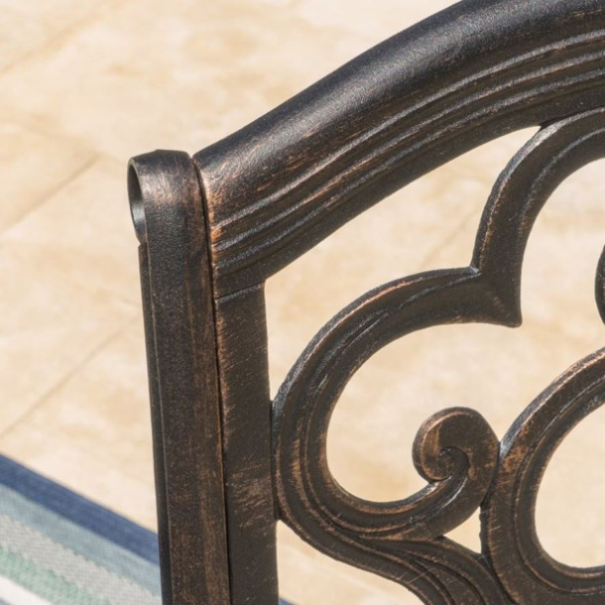 These cast aluminum dining chairs are a wonderful addition for any patio, whether you have an existing dining set or not. These chairs are great on their own or to complement other sets. These chairs have a soft cloud like design on the chair back. Featuring anti rust properties do to their aluminum build along with a comfortable seat, these chairs have everything you need.
