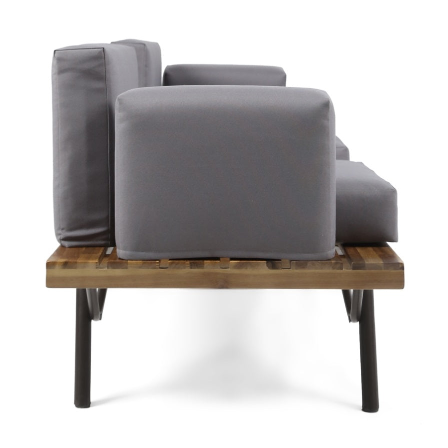Includes: One (1) Sofa. Material: Acacia Wood. Cushion Material: Water Resistant Fabric