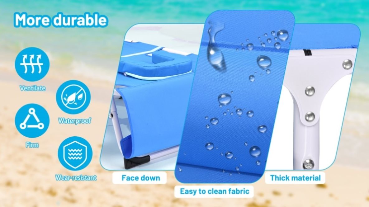 Sturdy FrameThe Frame of the adjustable lounge chair adopted by durable round tube.Weight capacity up to 400 pounds.Besides,the adjustable folding chair comes with a soft pad which is made by cotton,and it is soft for skin, comfortable and breathable.Equiped with a removable pillow and side pocket to ensure a comfortable support for your neck and head when you are sleeping on it.