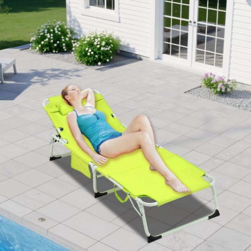 Sturdy FrameThe Frame of the adjustable lounge chair adopted by durable round tube.Weight capacity up to 400 pounds.Besides,the adjustable folding chair comes with a soft pad which is made by cotton,and it is soft for skin, comfortable and breathable.Equiped with a removable pillow and side pocket to ensure a comfortable support for your neck and head when you are sleeping on it.