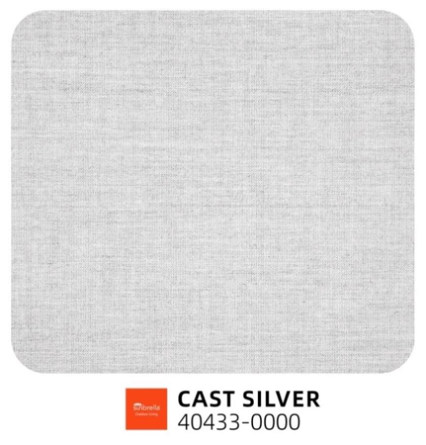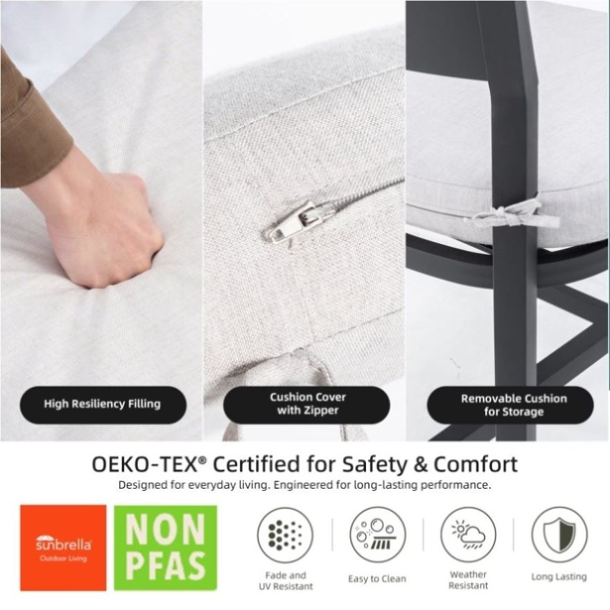 Sunbrella Fabric Cushion – Durable & Weather-Resistant – Upholstered in premium Sunbrella fabric (Cast Silver), the cushion is thicker, fade-resistant, stain-resistant, and designed for outdoor durability. The removable high-density foam cushion offers great resilience, retains its shape, and features a zippered cover for easy cleaning.