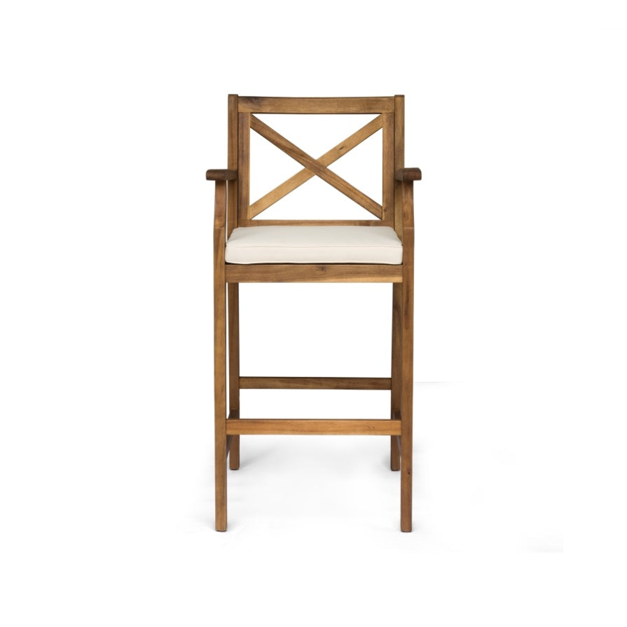 Give your outdoor dining or bar area an inviting transitional vibe, bringing a subtly upscale flair to even the most unassuming home. Composed of rich acacia wood and topped with cozy water-resistant cushions, this set of two classy, yet modern barstools will not only provide hardy durability but will also complement any outdoor bar or dining set up. These are finished with a beautiful cross-back design that strikes a perfect balance of farmhouse charm and stunning sophistication for all to admire.