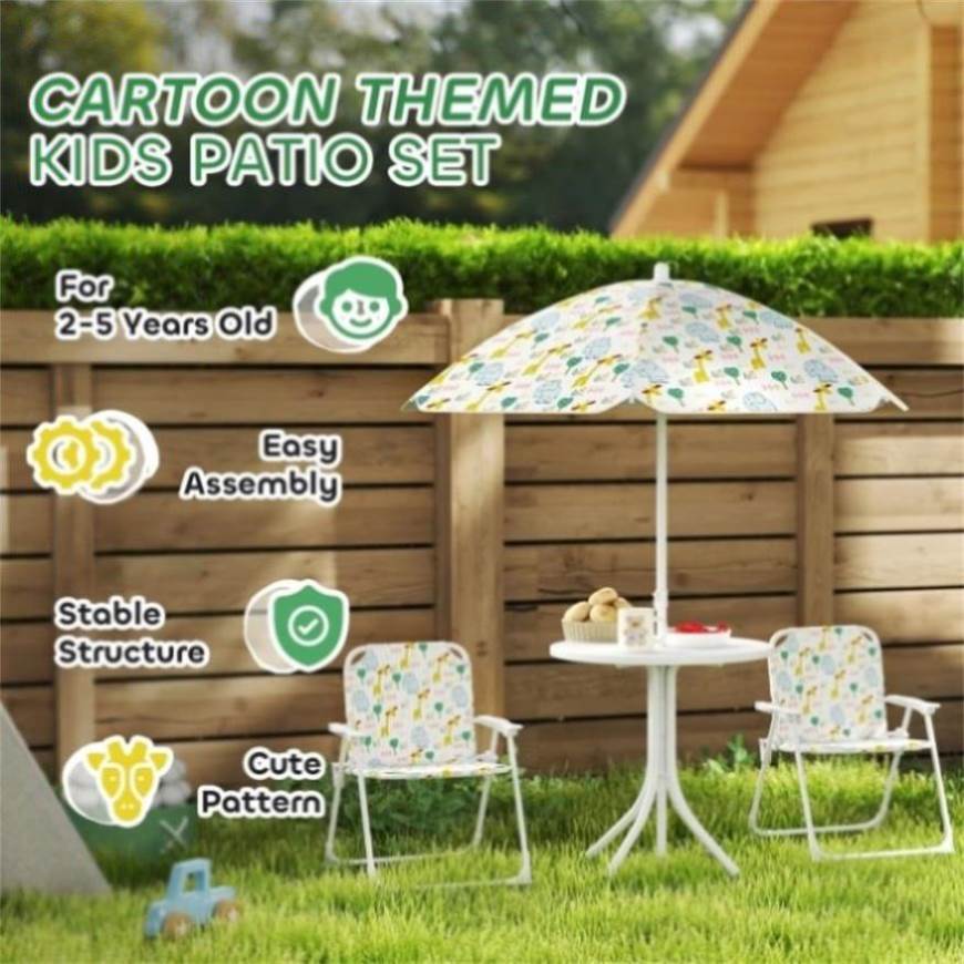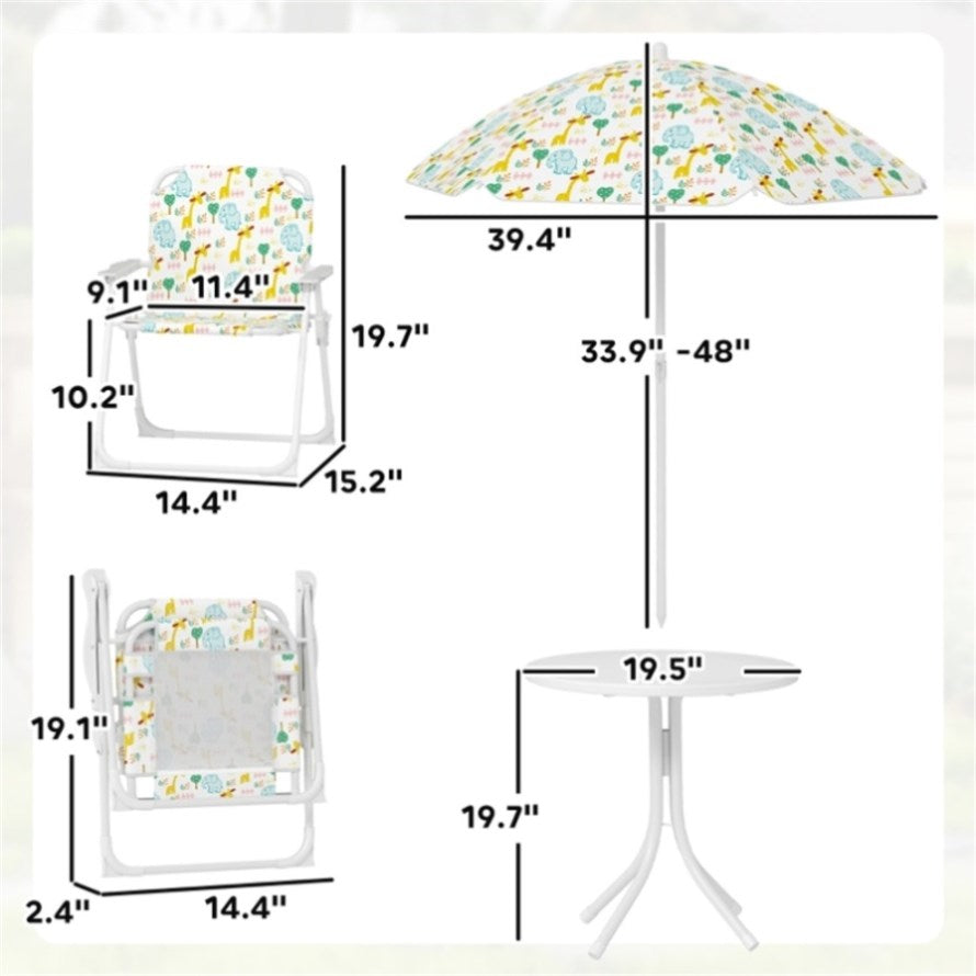Features: - Four-piece set, includes chairs, table and umbrella - Cute elephant and giraffe design engages children's imaginations - Removable and adjustable umbrella adjusts in height for optimal shade - Chairs and table fold for easy storage and transport - Suitable for children aged 2-5, enhancing usability - Support feet...