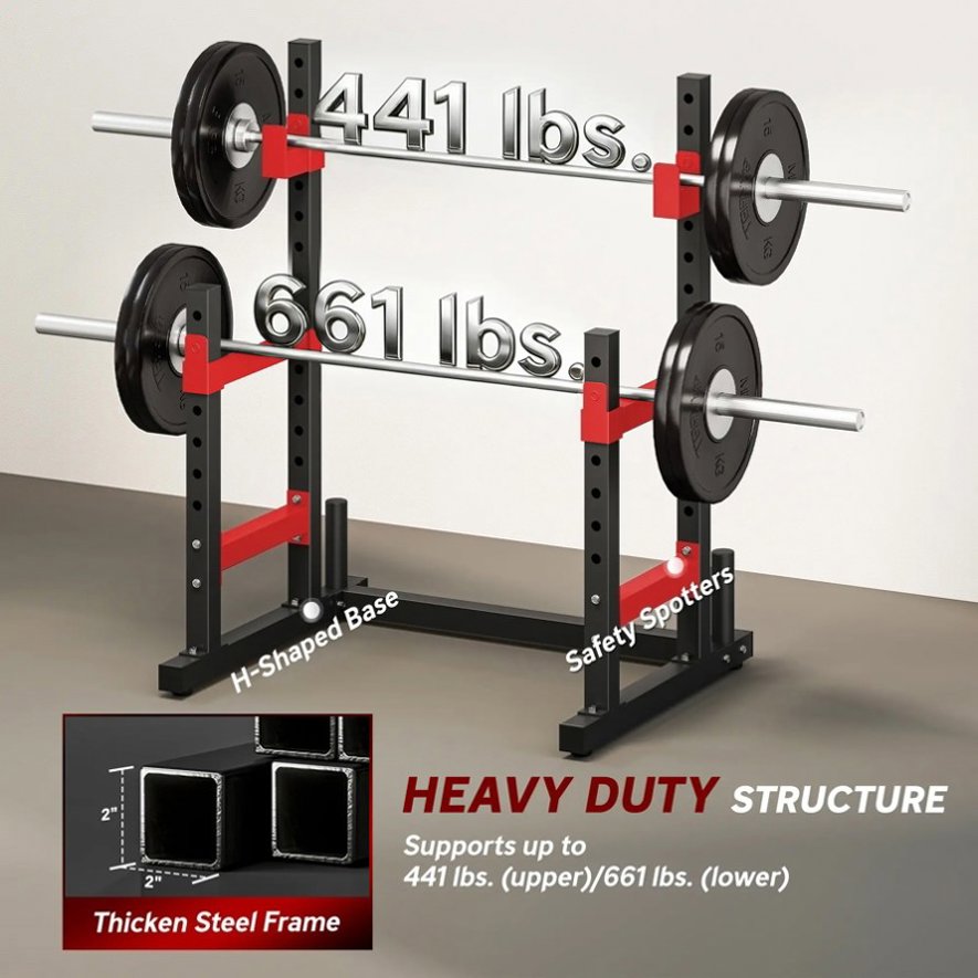 Features: - Dual barbell holders allow seamless switching between exercises for efficient workouts - Highly adjustable J-hooks fit various users and diverse workouts - Four safety spotters provide a wider catch area for enhanced protection - Heavy-duty steel frame supports up to 660 lb for safe heavy lifting - Integrated...