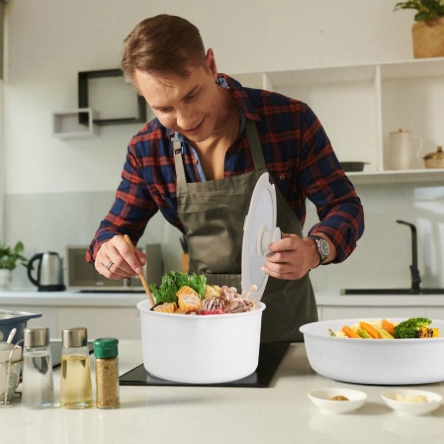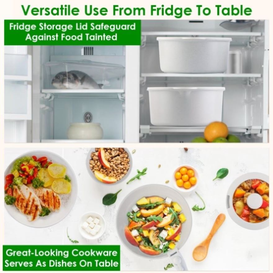 • Convenient Detachable Handles: Designed with unique detachable cool-touch handles, allowing for seamless transition from oven to stove to tabletop. Dual safety lock protection ensures secure attachment, preventing accidental dropping from the pan. Clear tempered glass lids enable you to monitor your cooking task and maintain the flavor of delicious food, while fridge storage lids safeguard against food tainted.