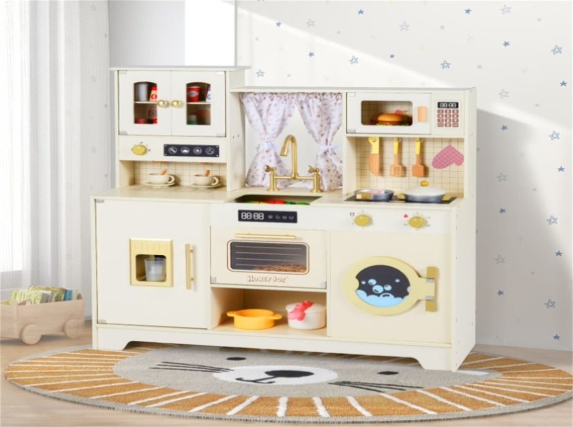 • Abundant Storage Space: Equipped with double-door cabinet, prep countertop, ice maker storage, microwave storage, 3 hooks, oven storage, open compartment and washing machine storage, this kitchen play set keeps all kitchen accessories neatly organized and accessible.  Moreover, this feature also teaches responsibility.