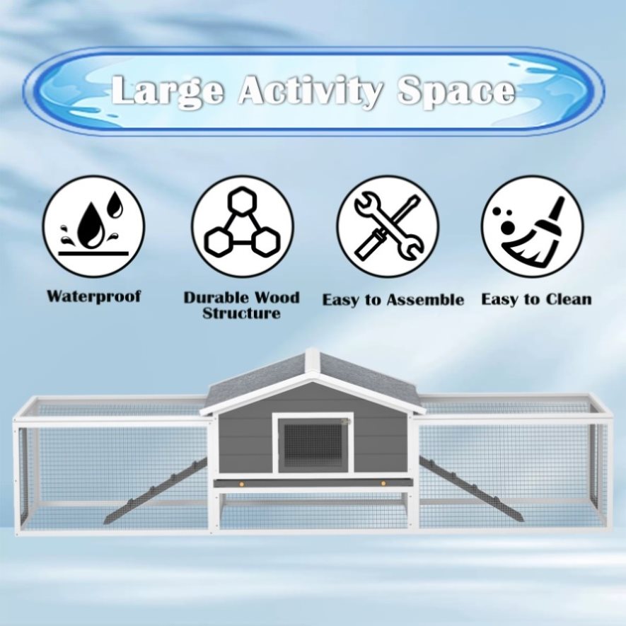 Large Activity SpaceThis rabbit cage has a living space in the upper part and a large running area in the lower part, providing plenty of room for your pet to rest, play and exercise. With ample exercise and private sleeping areas, it provides the perfect home for rabbits, guinea pigs, chickens, ducks and other small pets.