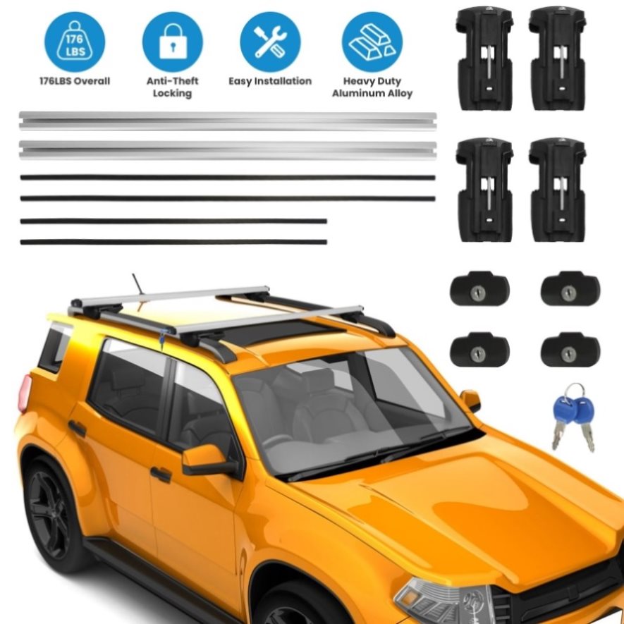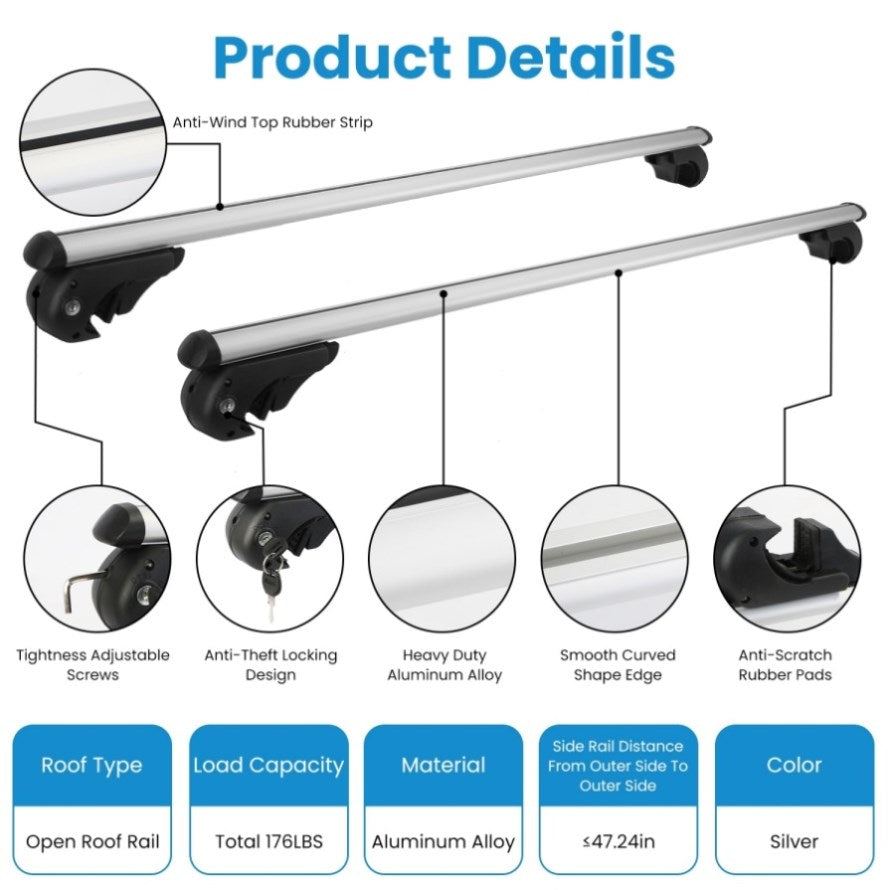 Made from high-strength aluminum alloy materials, our cross bar can withstand severe weather and can bear up to 176lbs in total. At the ends of the cross bar adopt smooth curved shape design and added rubber strips to effectively decrease wind noise and resistance. And each across bar comes with an anti-theft lock to ensure the security of the cross bar. Additionally, it can be easily mounted on most vehicles easily and quickly to carry bike, kayak racks, cargo frame, cargo boxes, snowboard, surfboard, etc.. Perfectly fit most cars, Vehicles and SUVs with existing raised side rails with gap, whose distance from outer side to outer side is no more than 44.1in, and thickness is less than 1.97in.