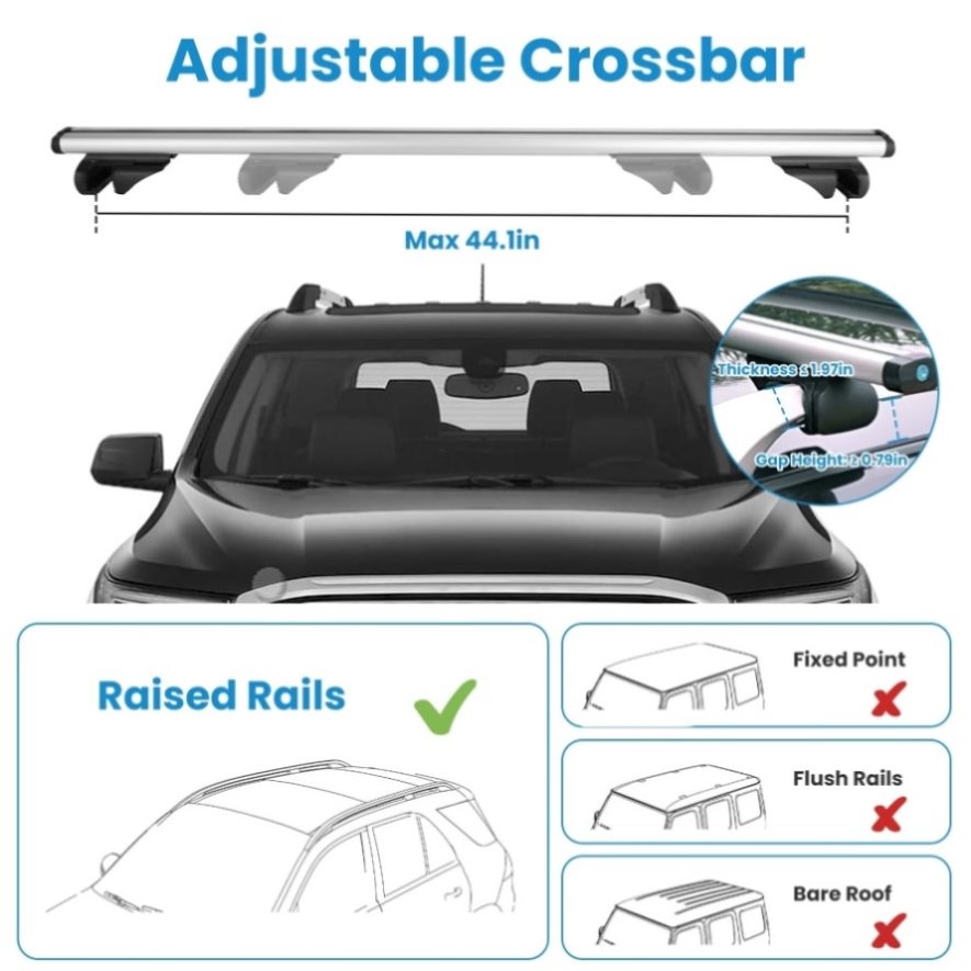 - Raised Rail Fit: Our car roof rack cross bars are perfectly suitable for the cars, vehicles and SUVs with existing raised side rails with gap, whose distance from outer side to outer side is no more than 44.1in, and thickness is less than 1.97in.