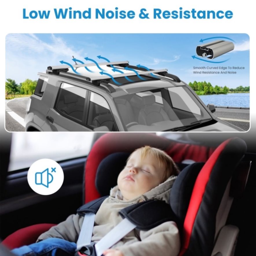 - Low Wind Noise & Resistance: Smooth curved shape in the edges of crossbar and added rubber strips can effectively decrease wind noise and resistance and meantime hardly have effect of the beauty of vehicles.