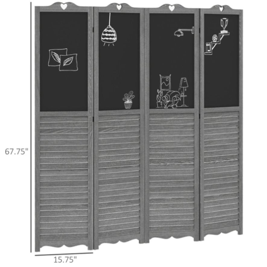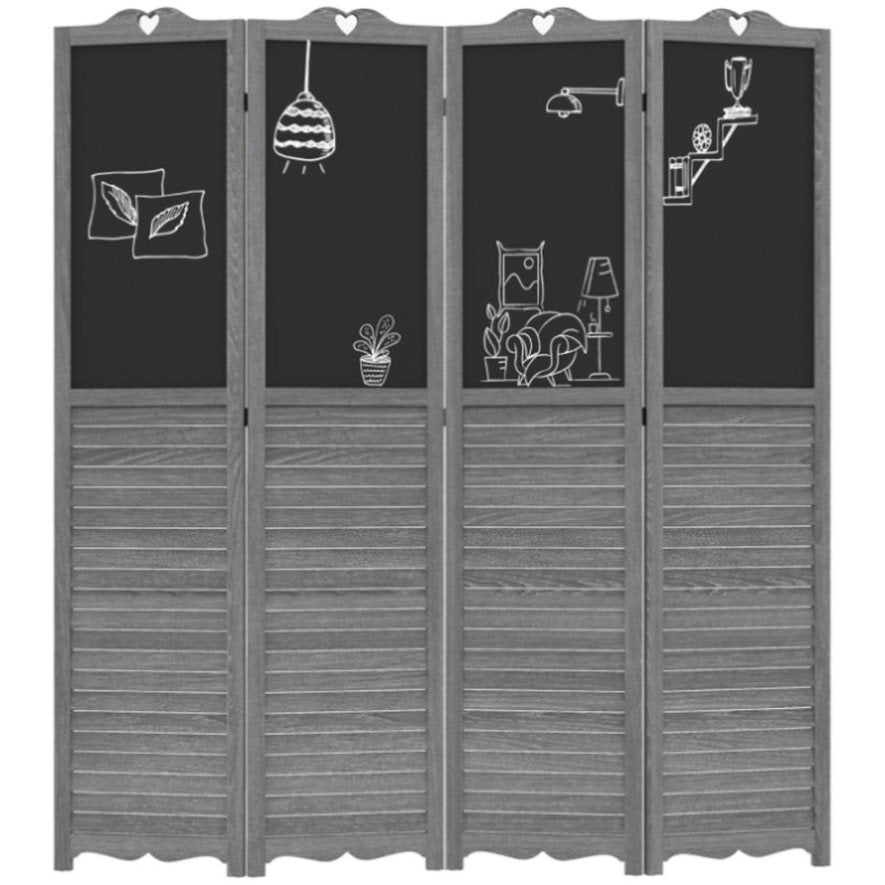 Features: - Great for creating a personal space or dividing up large rooms - Folding design with four panels, easy to create a new look and space-saving to store - Solid wood with blinds patterns for solidness and a rustic feeling - With blackboard to write notes or draw designs...