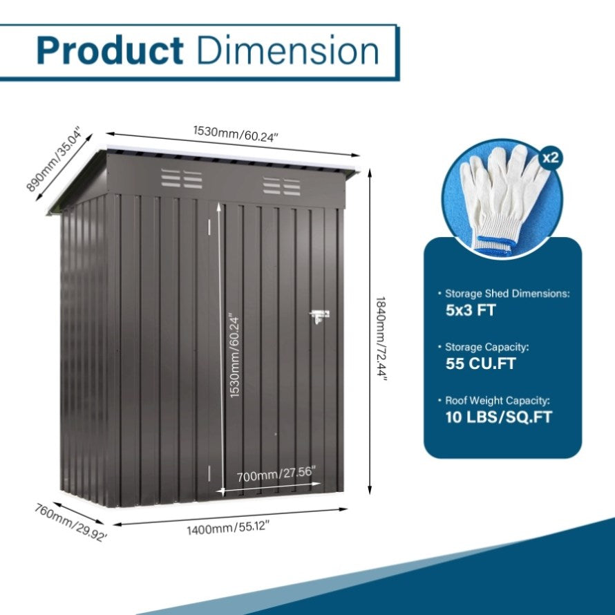 : 5X3FT (approximately 60.24×35.04×72.44 inch), suitable for balcony and courtyard corners. It can easily accommodate garden tools, sports equipment and daily miscellaneous items. The internal space can be equipped with shelves and hooks to achieve orderly and categorized storage.