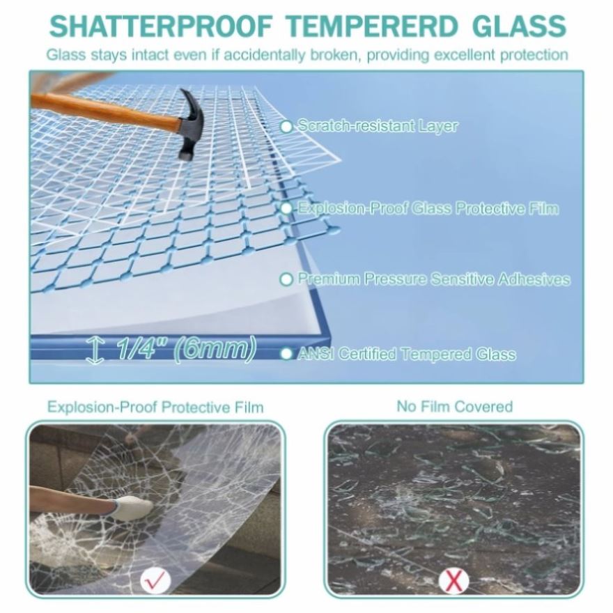 Made from 1/4" (6mm) ANSI-certified tempered glass, our doors offer superior impact resistance. The explosion-proof film prevents glass shards, enhancing durability and safety.