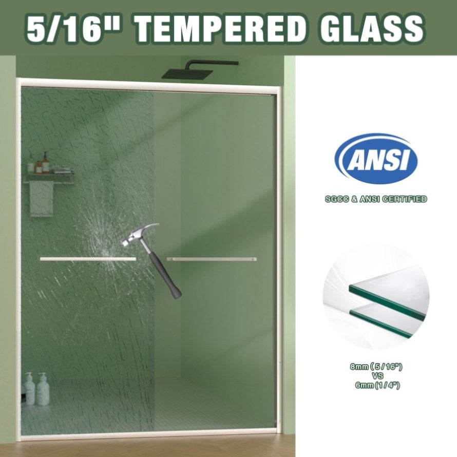 Safe Fashion HighlightMade of 5/16" (8mm) SGCC & ANSI certified tempered safety glass,which is durable and unbreakable,also not easy shatter, providing a safe and worry-free shower environment. The glass has a chamfer-edged design to protect your hands from scratches.