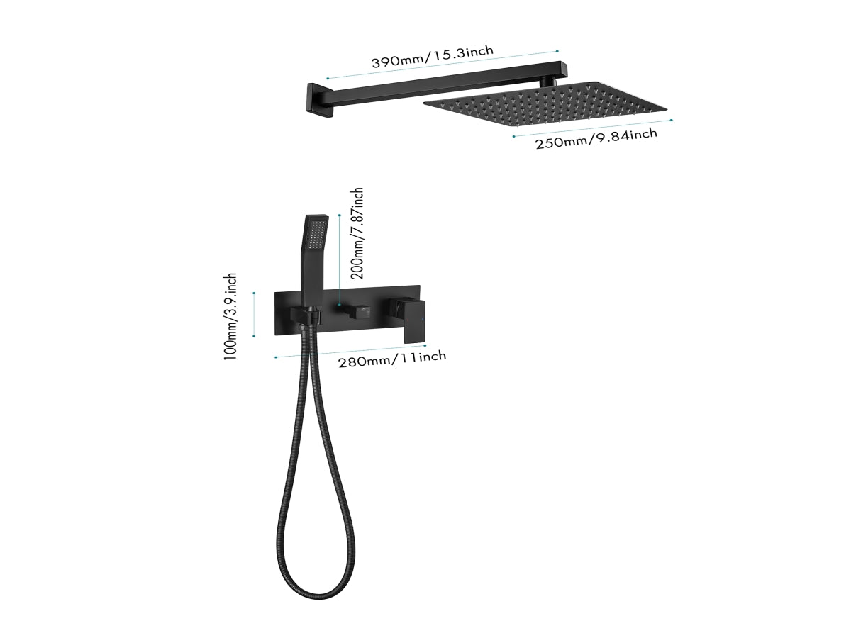 Package Includes: Wall mounted shower faucet set includes 10-inch rain shower head with handheld sprayer and 59-inch hose, brass shower mixer valve, brass handheld.