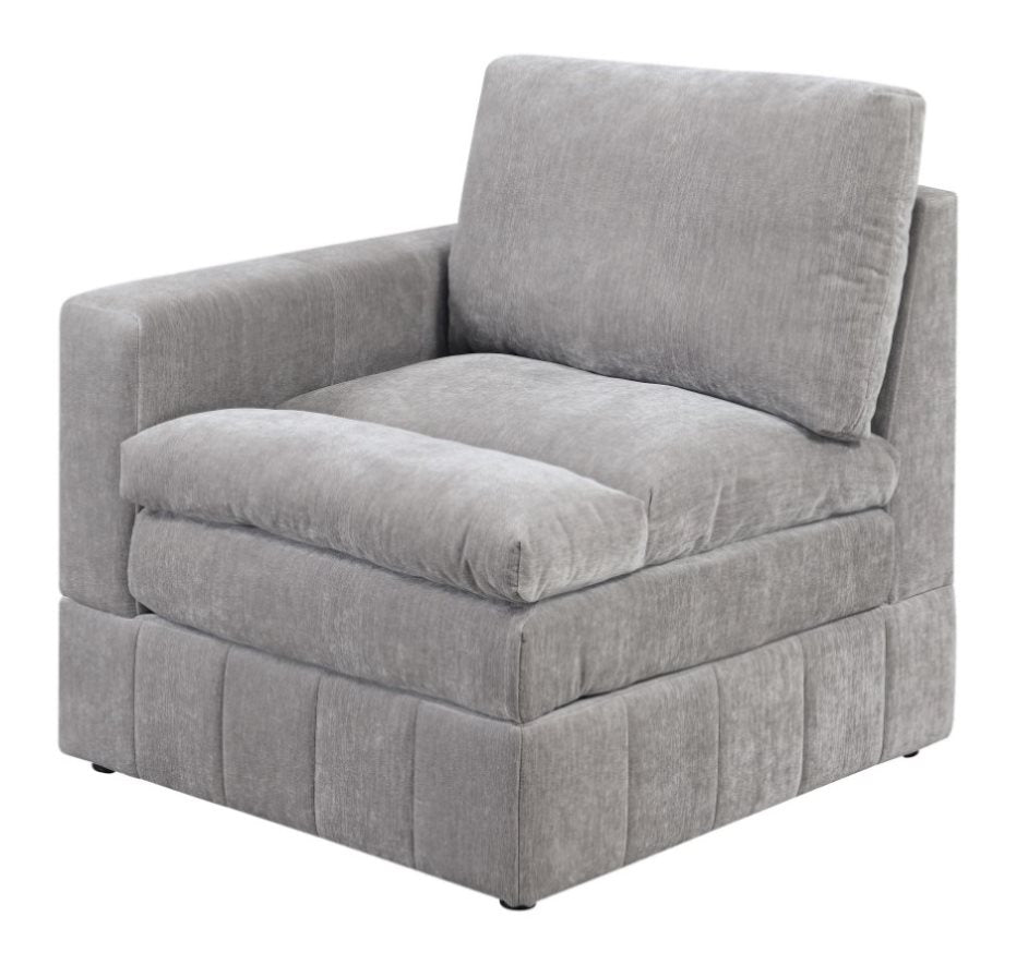 Contemporary StyleGranite ColorMorgan Suede FabricTriple Layer CushionClassic LookPlush Pillow Top SeatModular One Arm chairListing Includes :- 1 x LAF / RAF One Arm Chairs only. Product Description Product Description:- A triple layer cake comes to mind with this extraordinary designed modular sectional set. Each piece is crafted with three tiers...