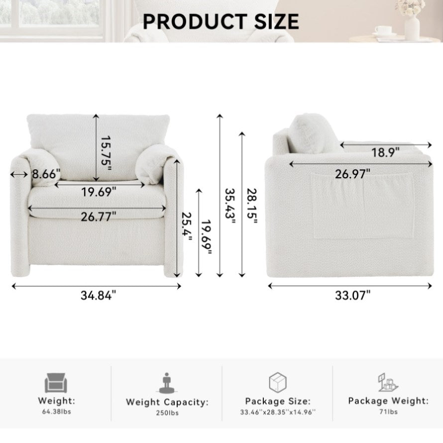 Product Dimensions: 33.07"D×34.84"W×35.43"H, Weight: 64.38LBS, fitting well in various room sizes.Package Dimensions: 33.46"L×28.35"W×14.96"H, Weight: 71LBS.Comfortable Materials: This modern style sofa chair is made of comfortable and breathable chenille material to provide a luxurious and soft seating experience. No matter what kind of room scene - living room, family room, bedroom...