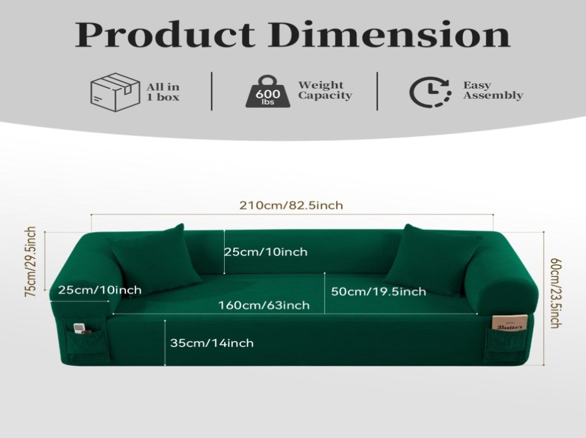 Handy features – Side pockets for remotes, books, snacks – easy peasy. Plus 2 matching pillows for extra coziness and that polished look.