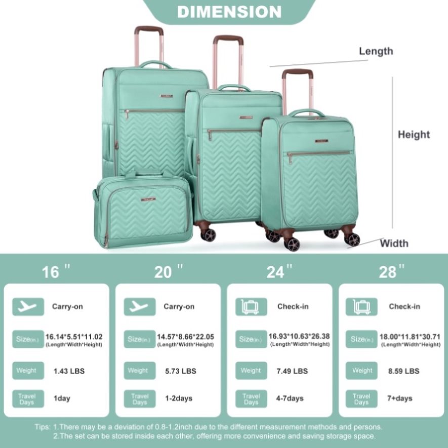 Material: 100% Terylene Extremely lightweight and durable.Four luggage bags, 16 inches and 20 inches, can be carried with you, and 24 inches and 28 inches can be checked in. They can be placed inside each other, providing more convenience and saving storage space. Each size can accommodate your needs perfectly.Spacious...