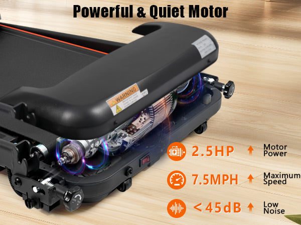 Incline Treadmill-2.5HP Motor : This treadmill for home achieves intense workouts with a powerful 2.5HP motor and 5% incline adjustment, seamlessly switching between walking (0.5-4MPH), jogging (4-6MPH), and running (up to 7.5MPH) modes to target fat burning, cardio, or high-intensity workouts to meet your diverse fitness needs