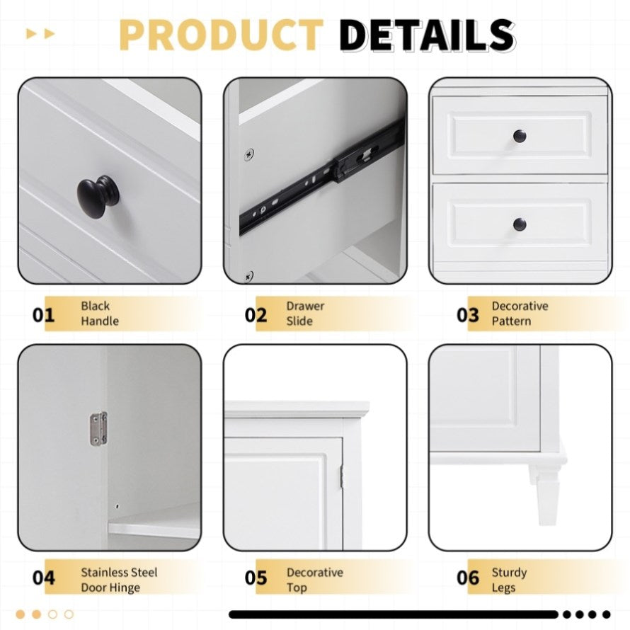 - Ample Storage Space: The closed cabinet with doors on the left has four layers to hold decorations or daily necessities. As for the lower and right sides, which have cabinets with doors and four drawers of different sizes, they can provide more storage space. You can put items such as shampoo, towels, body lotion, paper towels and storage baskets in them.