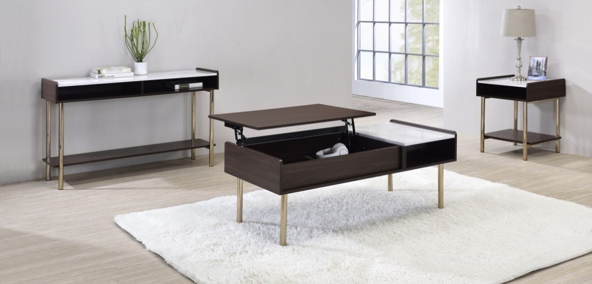 Crafted of engineered woods with walnut wood and white marble printed veneers and champagne finished iron base