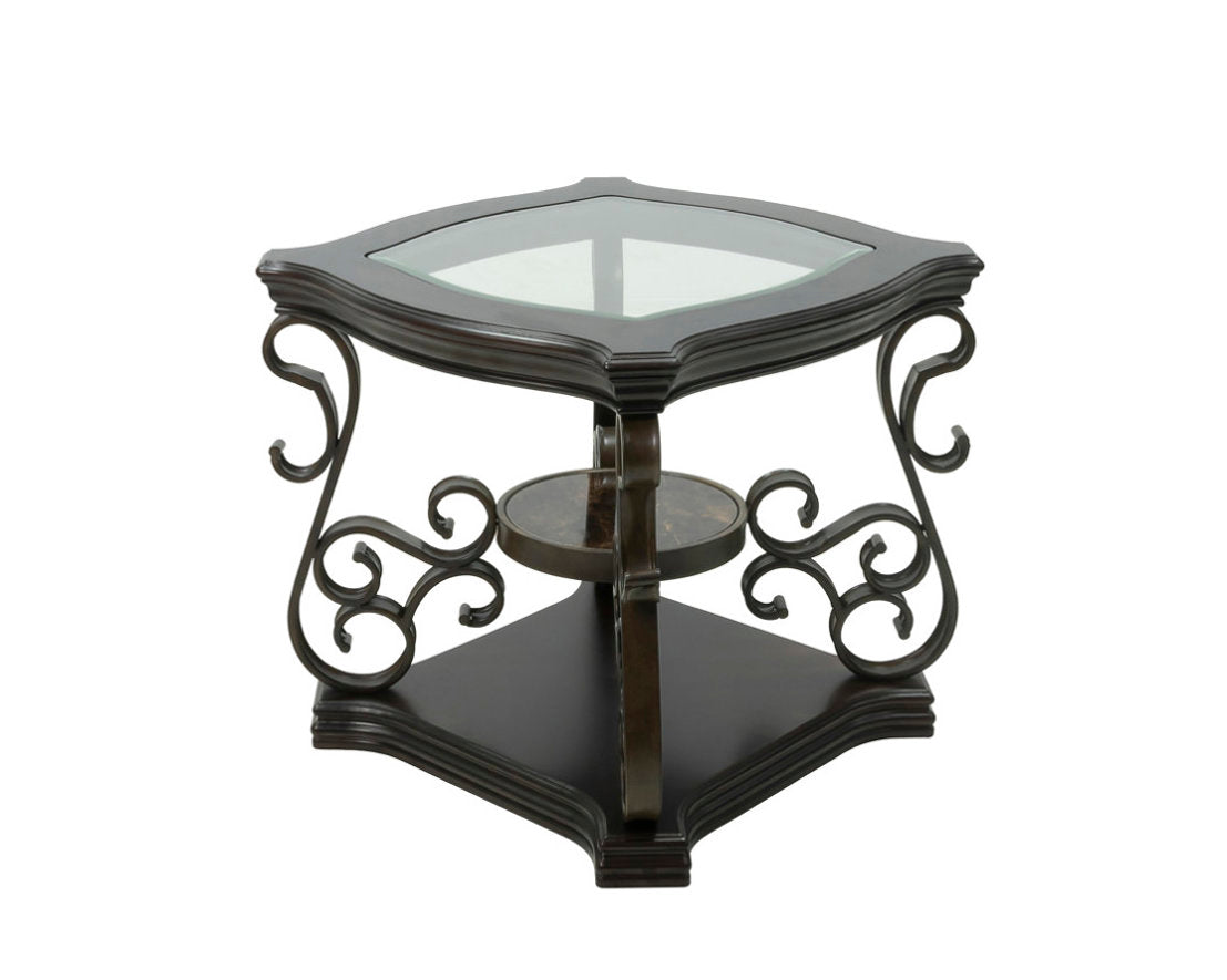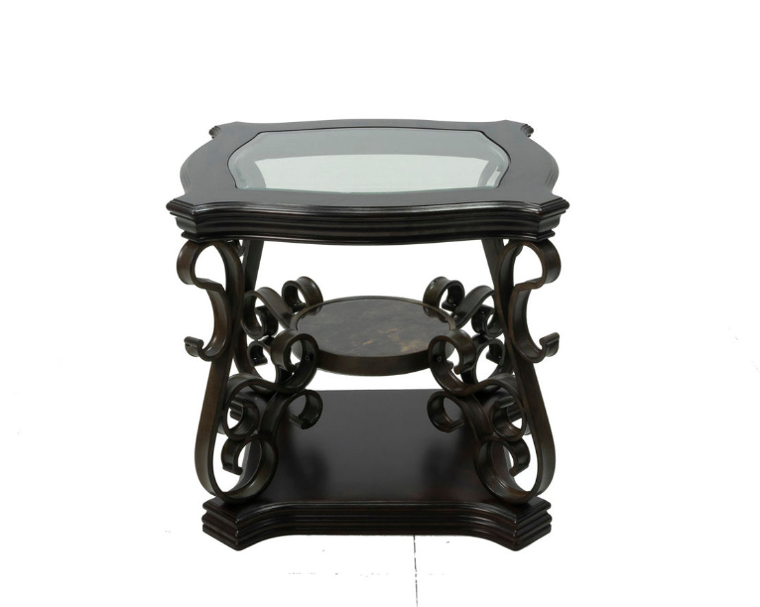 End table, Glass table top, MDF W/marble paper middle shelf, powder coat finish metal legs. W48720761