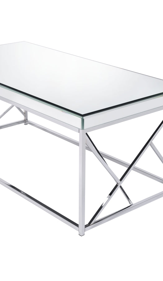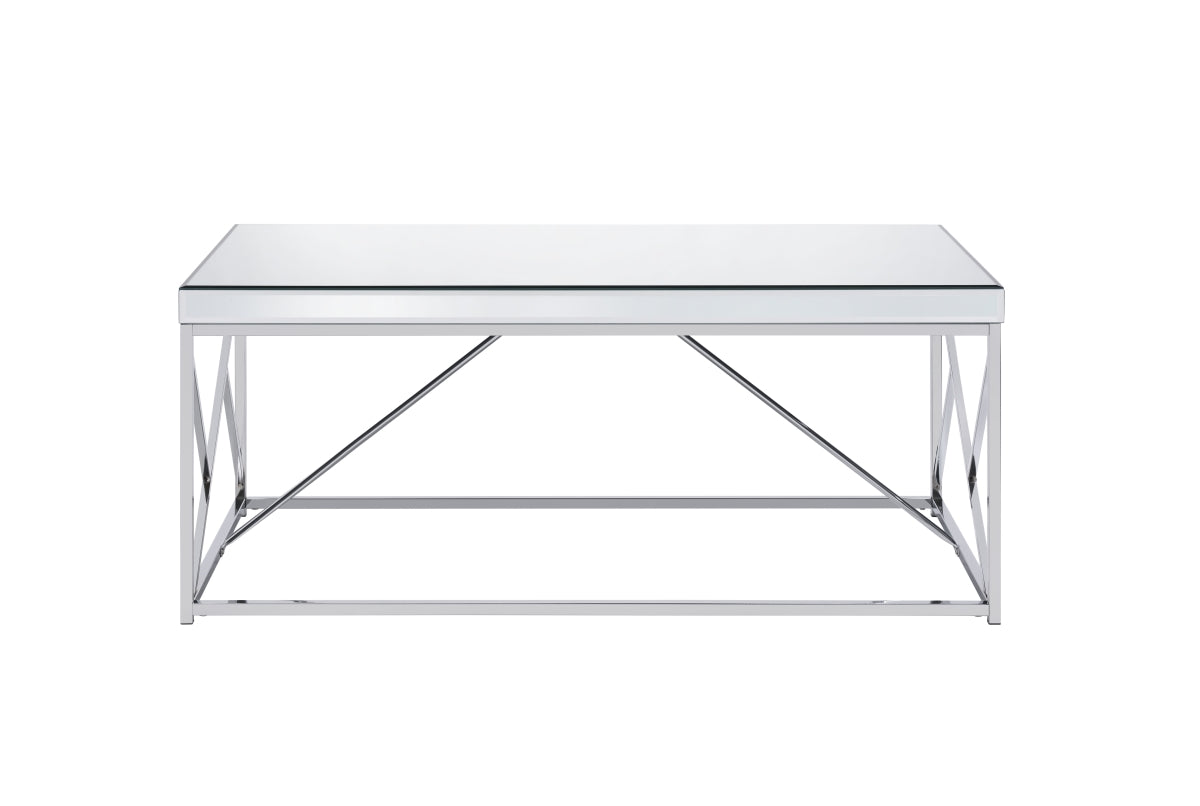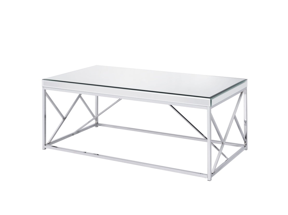Constructed of mirrored tops and sidesConstructed of mirror tops and sides with iron base in chrome finishContemporary styling features include mosaic metal side panels and mirrored top with mirrored apron railLarge scale cocktail table fills any roomProduct Dimensions (Approximately)30.15 x 60.96 x 50.8 (W x D/L x H) cmTotal Weight30.15...