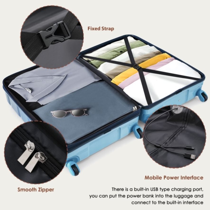 Made from extra strong ABS+PC material, which is lightweight and extremely durable. Features textured finish to prevent against scratches,keeping lightweight luggage set beautiful trip after trip.3 Piece Luggage setThe 20" carry on suitcase features USB charging ports (Power bank not included)Easy Maneuvering 4 360-degree rotating wheels make this suitcase as...