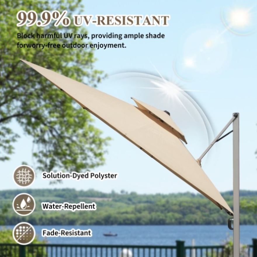 360° Rotation with Foot Pedal – Step on the pedal for effortless manual rotation to track the sun all day.5-Position Tilt Adjustment – Use the oversized ergonomic handle to set your perfect shade angle (15°-60° range).Hydraulic-Assisted Opening – Hidden side handle with smooth hydraulic mechanism for jerk-free operation.9-Rib Reinforced Frame...