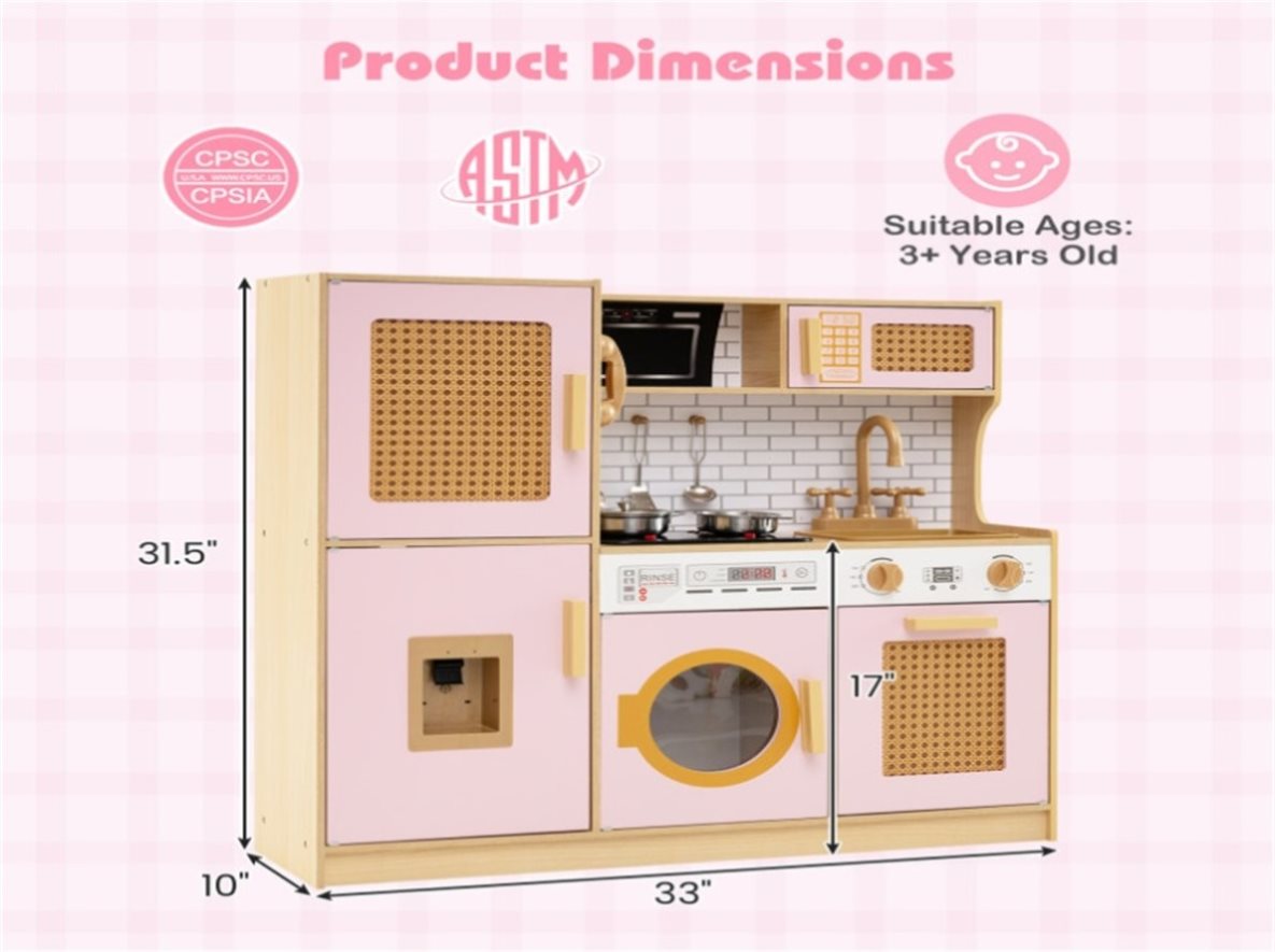 • Safety and Stability Combined: This toy kitchen set boasts a splinter-free surface and rounded edges, creating a safe environment for kids to play. ASTM and CPSIA compliant, the kids kitchen playset is a more reliable option for little chefs.