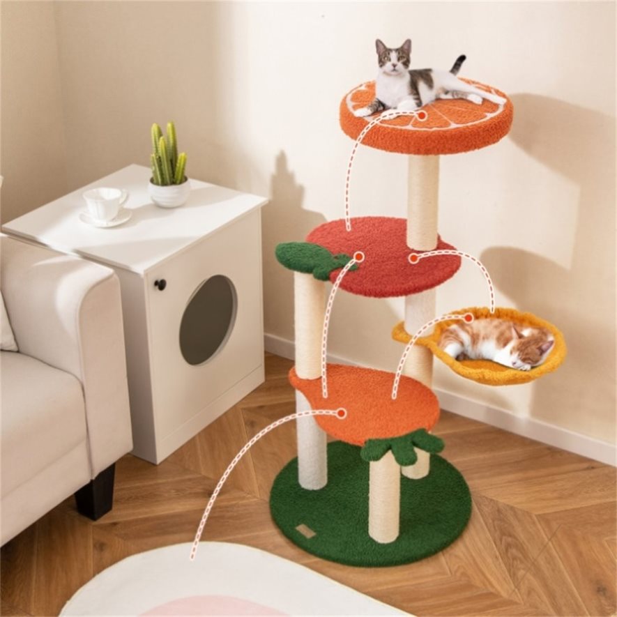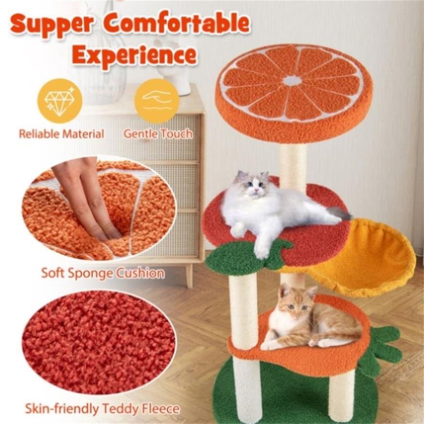 ● Whimsical Fruit-style Cat Tree: Add a zest of playfulness to your cat's life with the uniquely designed orange-shaped perch, apple-shaped platform, and carrot-shaped platform. The fruit-themed cat tree entertains your cat and serves as a charming decoration that brightens up your room.