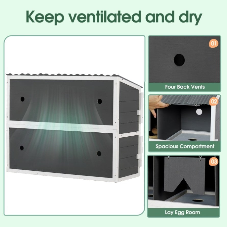►Outstanding Details◄: The PVC roof design prevents hens from perching on top of the nesting box, and prevents water accumulation on rainy days. Back side ventilation holes for fresh air flow to increase the ventilation and breathing capacity of the hens, and keeps the nest clean cool. Our perching bar design makes it easy for your chickens to enter and exit the laying boxes. The perch also folds up, preventing night roosting.